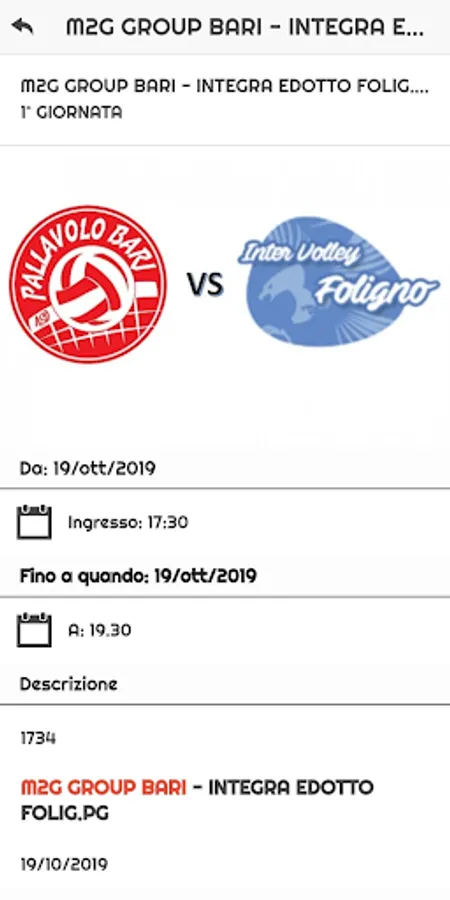 The following season, 2018-2019, sees the Pallavolo Bari, called M2G Group Bari in compliance with the main sponsor M2G Group, again participates in the league of B inserted in group E, including formations of Umbria, Marche and Abruzzo. The red and white finish the season in second place, competing in the promotion playoffs.
