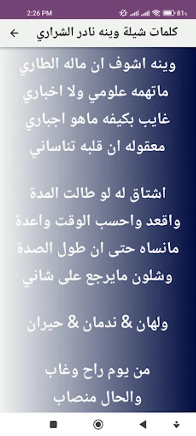 This application contains the new song of Nader Al-Sharari, Nader Al-Sharari 2022, Sheila Weina Nader Al-Sharari, Sheilat Nader Al-Sharari MP3, lyrics by Sheila Nader Al-Sharari, Nader Al-Sharari new.