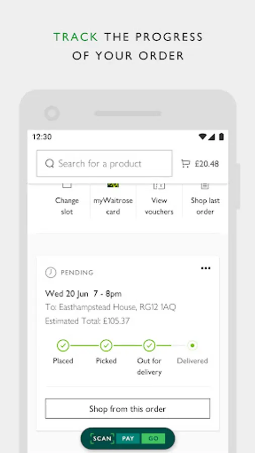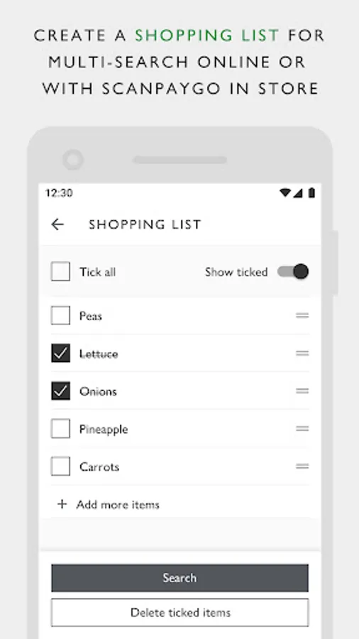 Available in the Waitrose app, ScanPayGo allows you to scan product barcodes, see a running total, pack your bags as you go and check out fast. And to make shopping even simpler you can write your shopping list from the app home screen before you arrive in store. You will need to register for a waitrose.com account and myWaitrose card to use ScanPayGo.