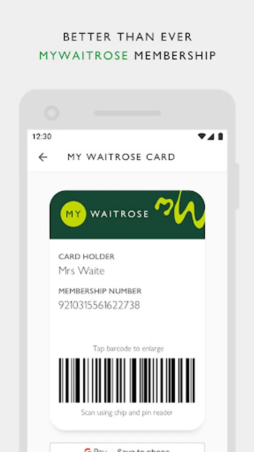 Leave your physical myWaitrose card at home and still benefit from the same great offers. Scan the digital card in the app at checkout or use it for ScanPayGo. You can also now add your myWaitrose card to your Google Pay wallet.