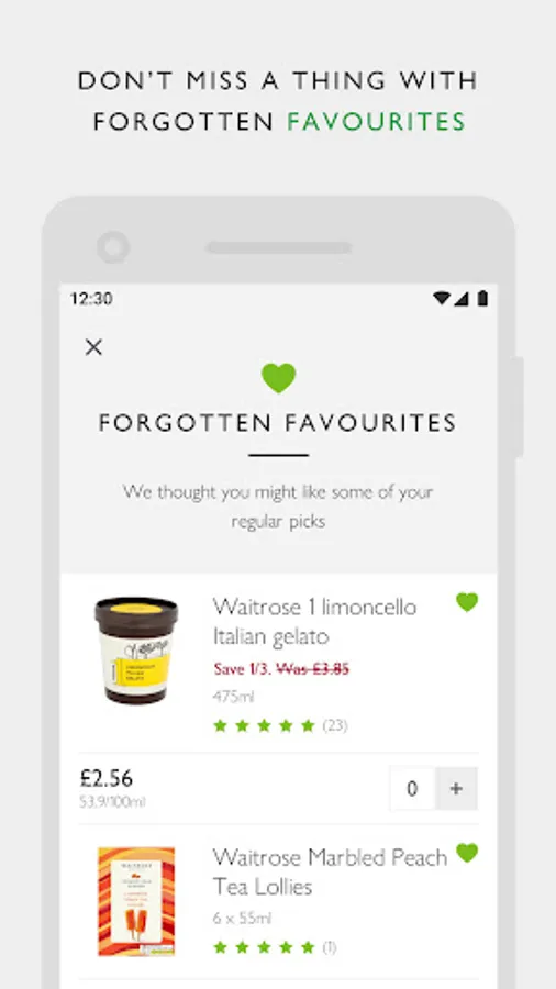 Easily find the items you regularly buy online and in-store. Any items you’ve previously bought online will be automatically added into your Favourites, and items you buy in-store using your myWaitrose card will also be listed. To add more items into your Favourites simply tap on the heart icons.