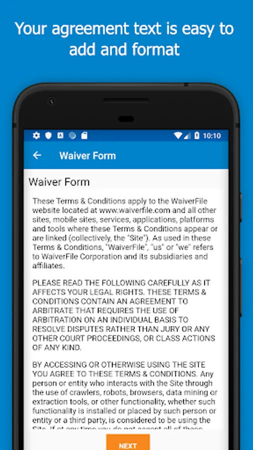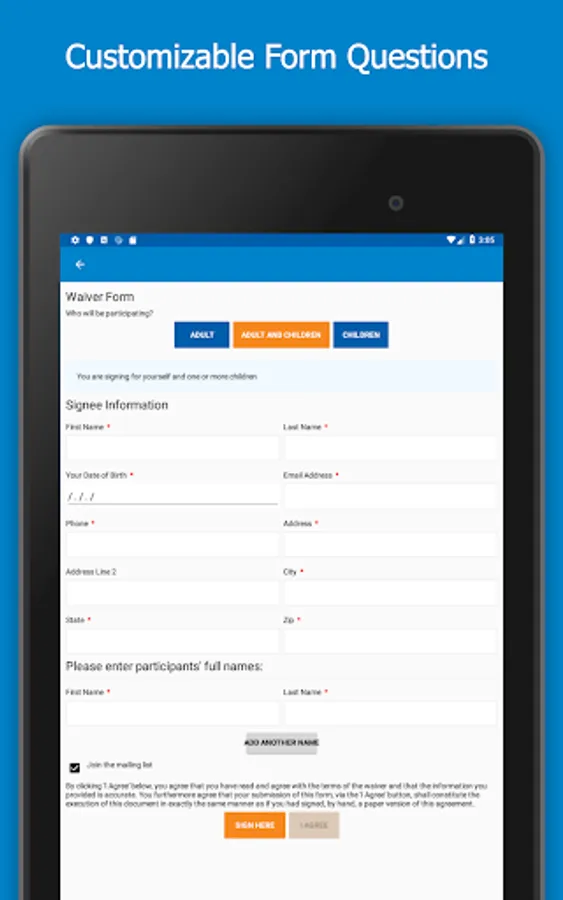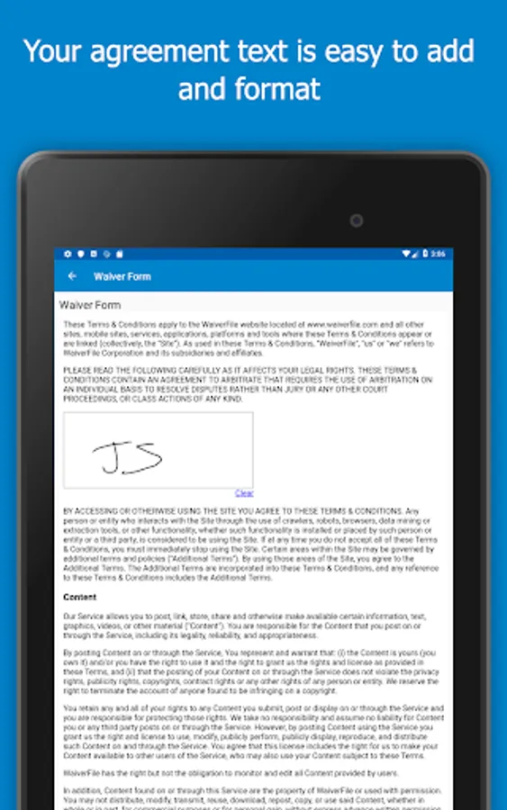 WaiverFile is an online waiver form service that takes your liability waivers and makes them paperless. Your customers can sign their waiver in advance online with any device. Our iOS app adds offline signing so you can collect customer waivers even when you have no internet connection. Collect the signatures and when your device is back online, the data is synchronized with our service and stored securely in the cloud.