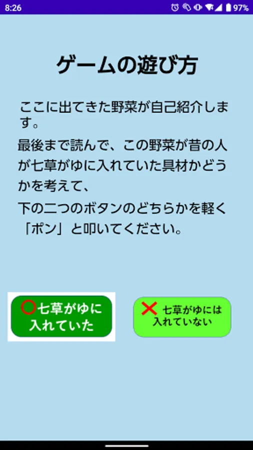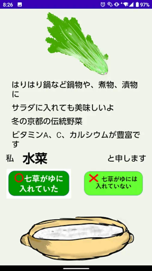 In this game, you will compete to see if you can sort out the "seven herbs" from the vegetables that come out of the vegetable basket, which also includes seasonal leafy vegetables other than the seven herbs. However, the original purpose is to let you know "the charm of seasonal leafy vegetables including seven herbs". Please do not worry about the time and stay with us until the end. And enjoy it slowly.