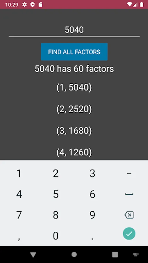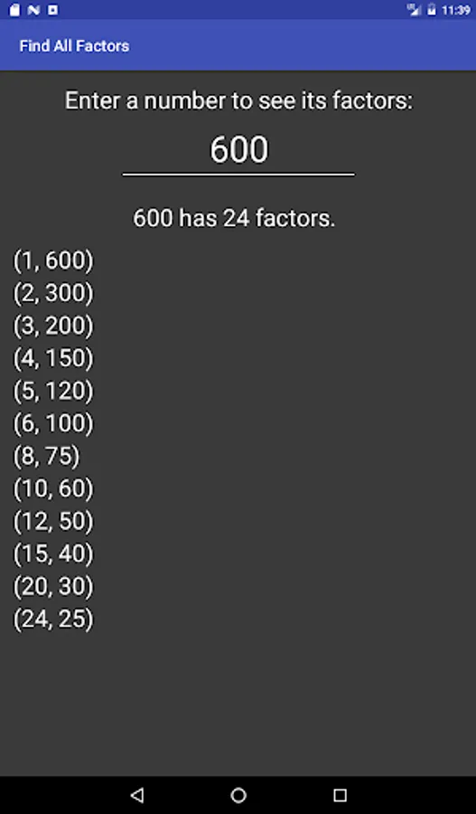 This app calculates and displays all of the factors of a number chosen by the user. It first displays how many factors the number has and then it displays all of the factors in pairs that multiply to equal the input number.