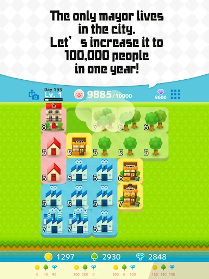 - Red buildings yield population. Yellow, green, blue buildings produce resources everyday!
