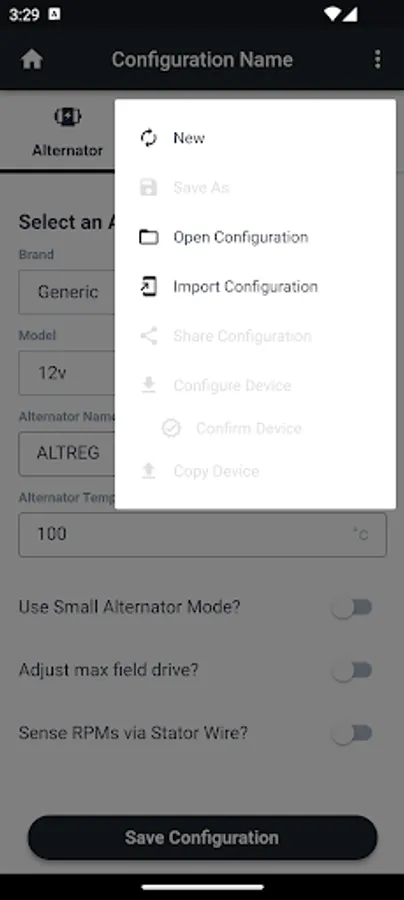 Once you have created your configuration it may be saved for later retrieval, shared via the built in ‘share’ tools (Email, messaging, etc), or sent directly to your WS500 Alternator Regulator. To program your WS500 regulator connect an OTG (On The Go) USB adapter to your Android phone and a common USB cable connected to the WS500. Select ‘Program Regulator’. This can even be done before the WS500 is installed. Alternatively, ‘share’ your configuration with a Windows based PC and use the Wakespeed “Universal Configuration Utility” (downloadable at http://www.wakespeed.com/technical ) and a USB cable.