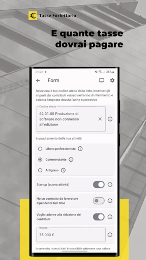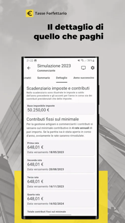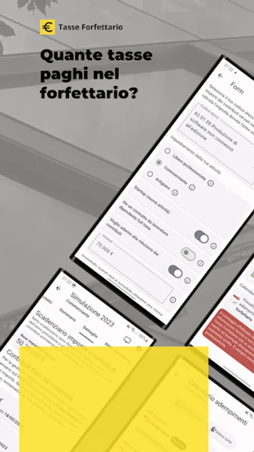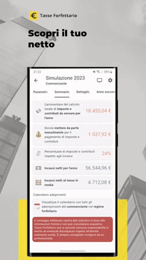 The Flat Rate Tax application was created to help professionals and sole proprietorships calculate their flat rate taxes. The main feature of the application is the tax and contribution calculator, which allows you to calculate the amount of taxes to be paid based on the data entered. The application offers two ways to enter data: a step-by-step wizard and a form for immediate data entry. In addition, the application can generate a simulation of the flat-rate tax calculation for the following years, allowing you to predict the amount of taxes to be paid in the following years and to adjust your business accordingly.