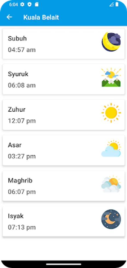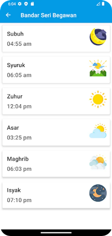 Waktu solat dan Azan Brunei : Imsak, Subuh, Syuruk, Zohor, Asar, Maghrib dan Isyak.