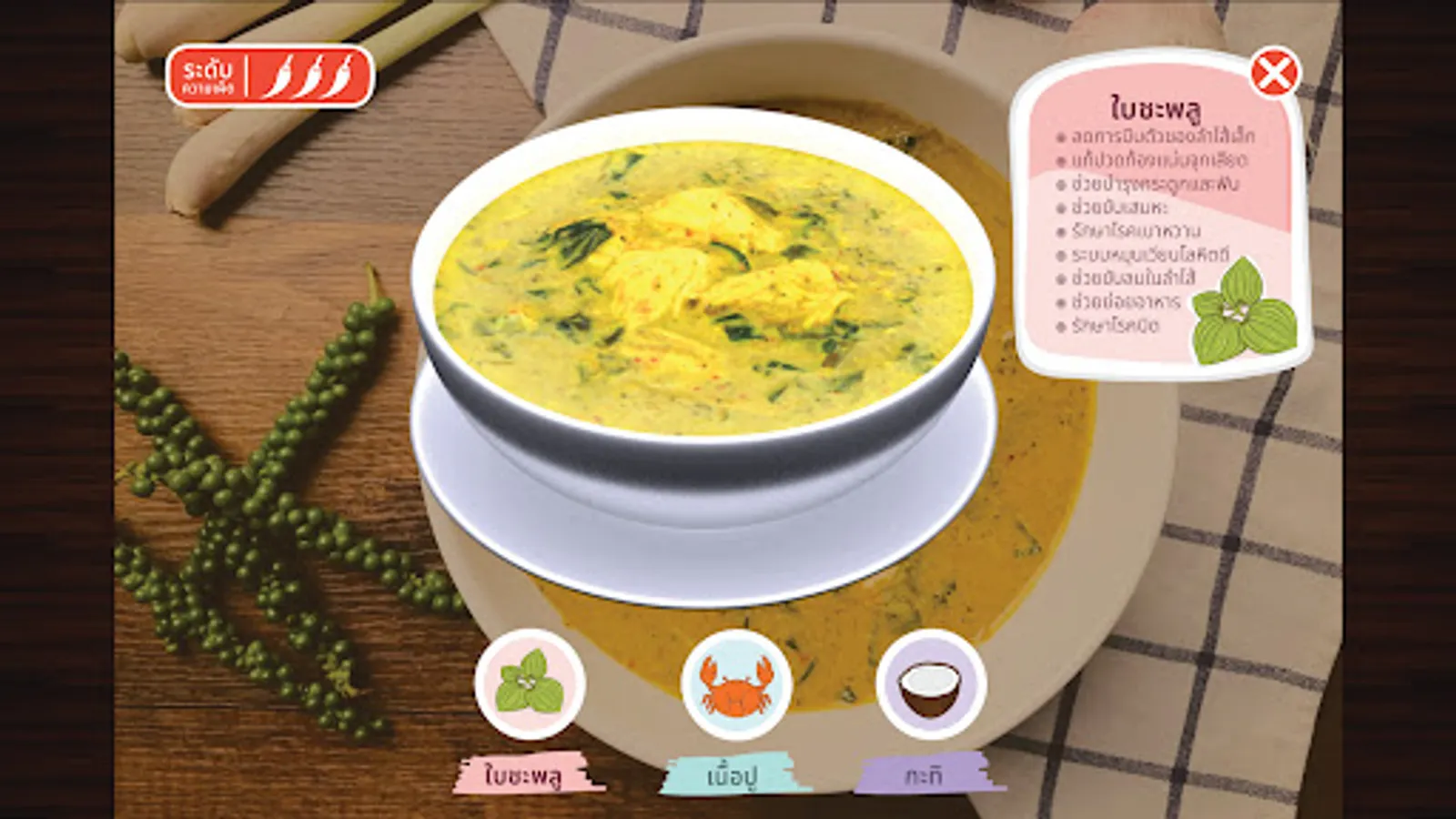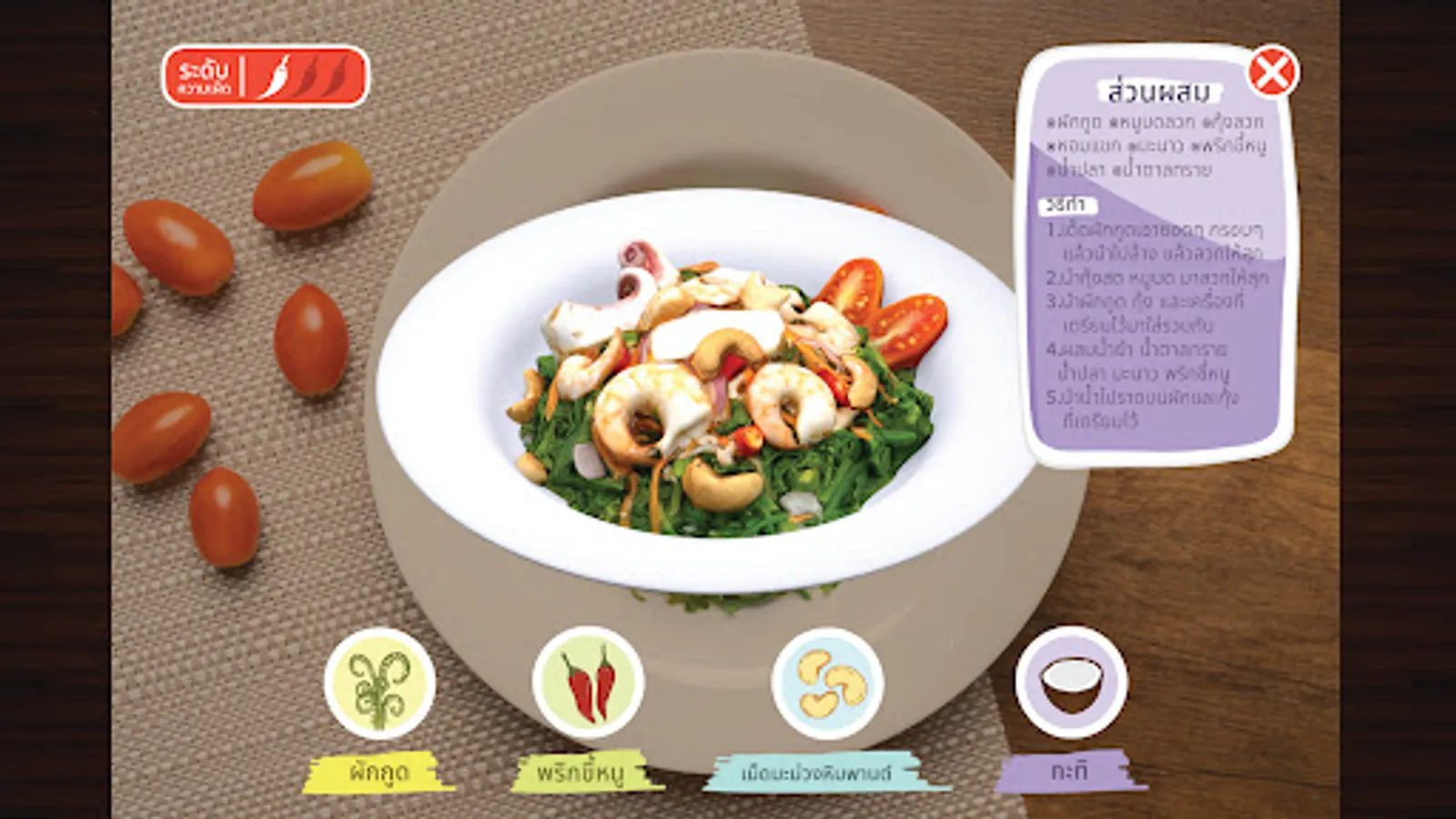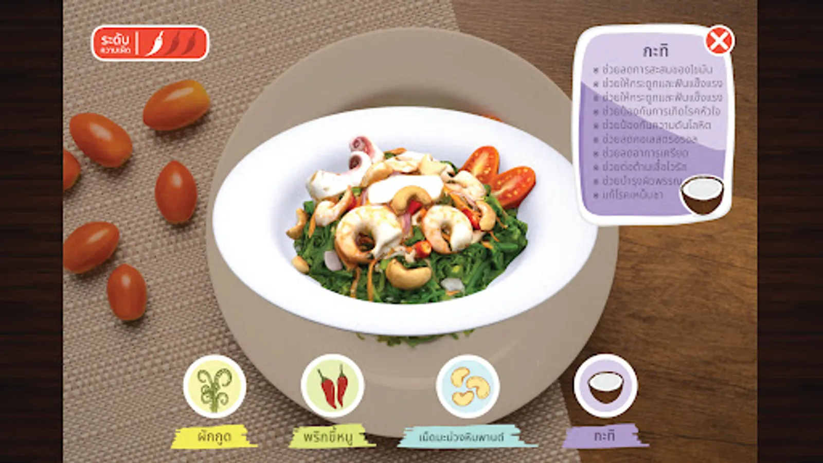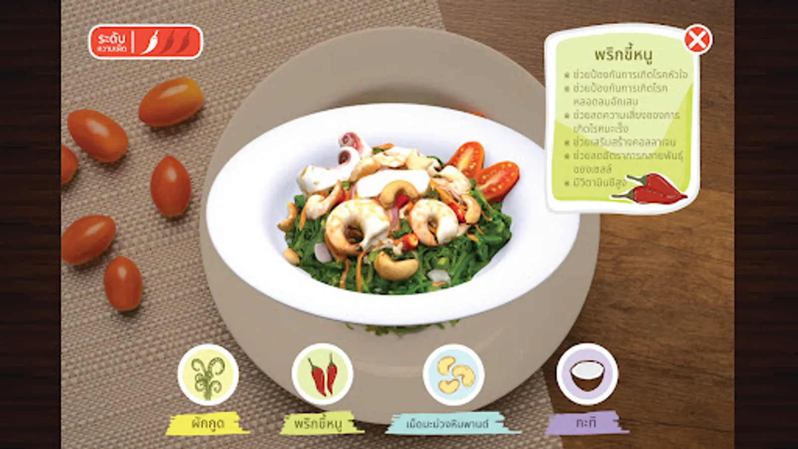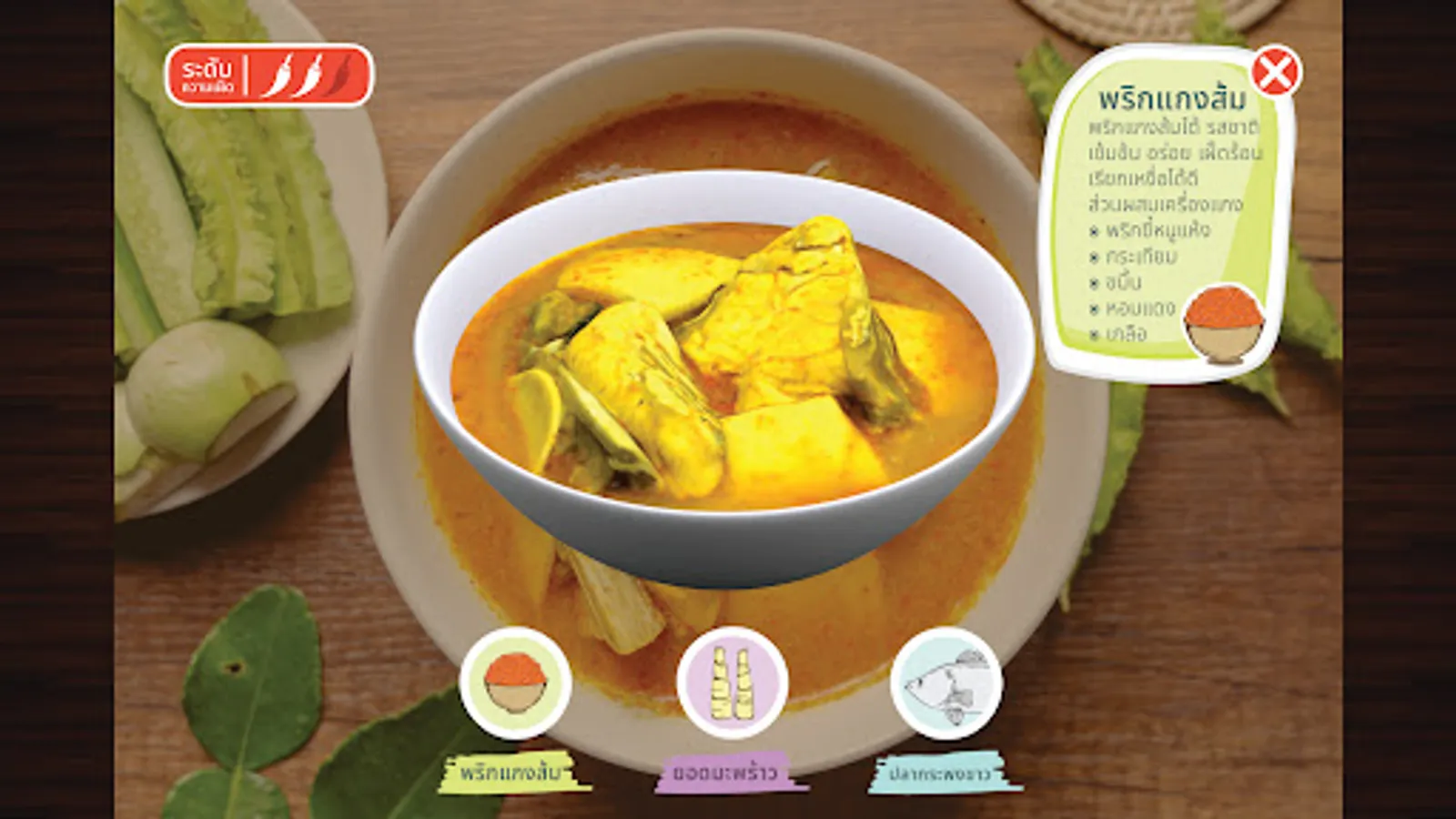 An application to display a 3D model about the food of Nakhon Si Thammarat province using augmented reality technology to support food tourism in Nakhon Si Thammarat province. The prototype of the application is defined as 15 items, of which 10 are savory items and 5 items for snacks/desserts. The savory items are divided into 5 types of curry or soup and 5 types of stir-fry or yam or fried items. Contains turmeric fried sand fish Scallop Curry with Betel Leaves Southern Thai dessert Stir-fried shrimp with shrimp paste, spicy vegetable salad, sauteed Liang leaves with egg, Kua Kling, Bak Kut Tae, selected mangosteen, jakoey, white glutinous rice cakes, Benjarong sticky rice and roti.