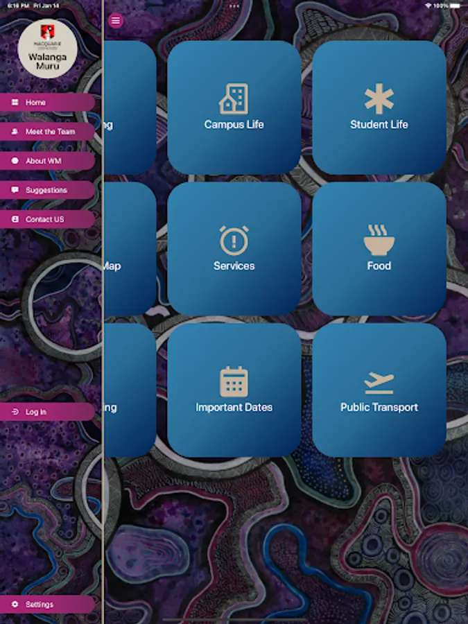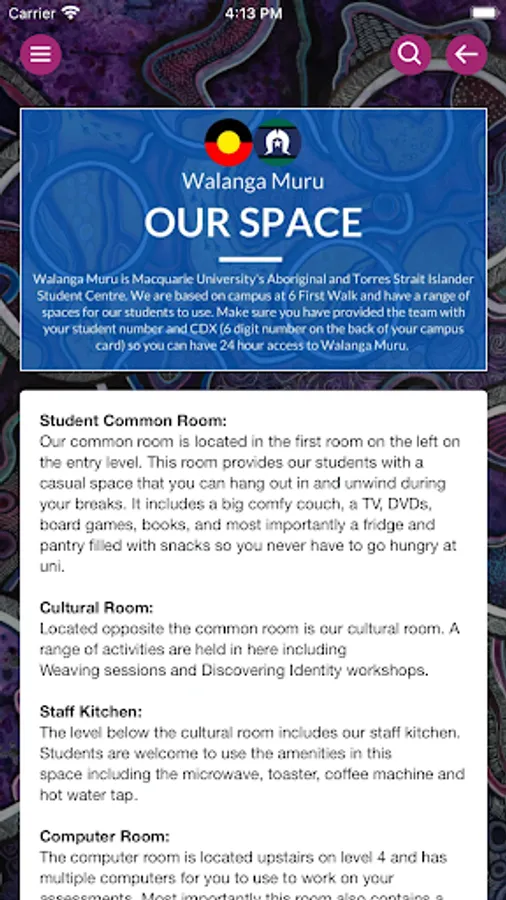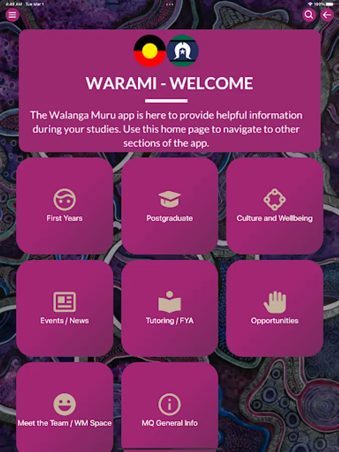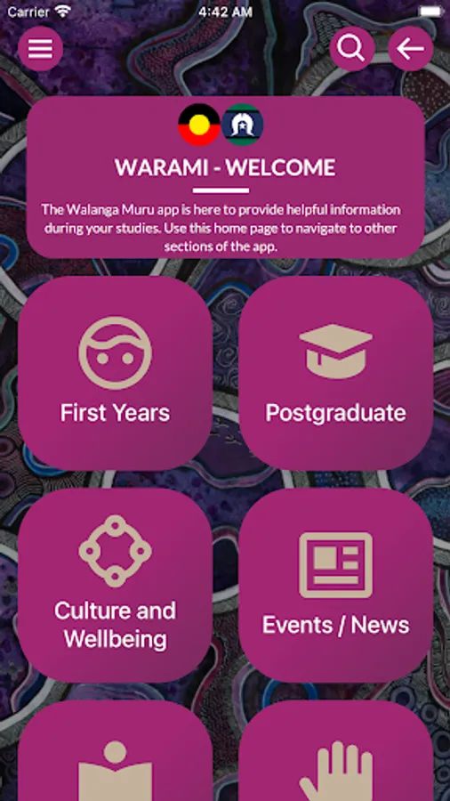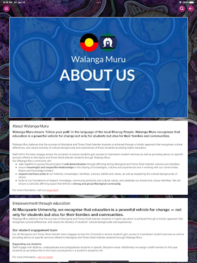 This application provides students and staff with information about events held by Walanga Muru, the wider university and the community. It also provides information and push notifications regarding holidays and other important dates.