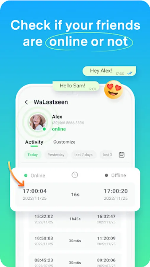 'It is not easy to keep an eye on the lastseen status of my family. I used this WhatsApp tracker to check chat App lastseen status with my son, I can control the time he uses WhatsApp. I can get notifications when he is online/offline and view his online notifications history with this Chat (Whats)App tracker, and finally correct his bad habit.' --Emily