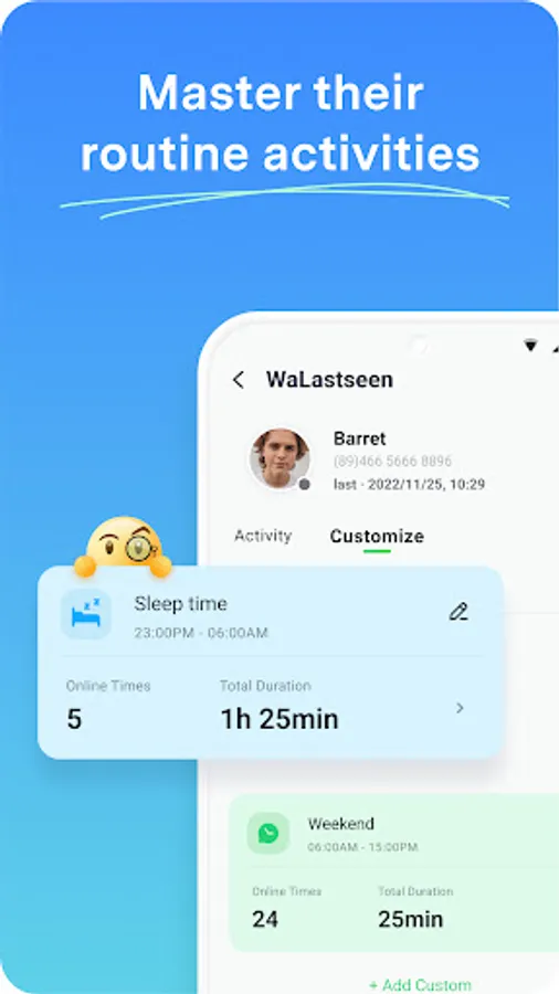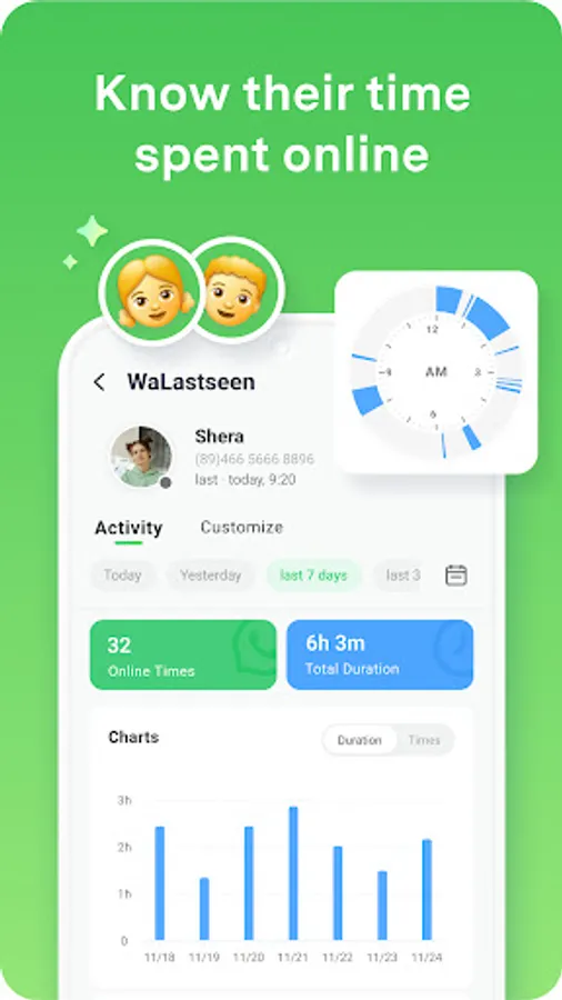 WaLastseen is a very powerful yet simple lastseen Messaging (Whats)App tracker, and you will find it easier than ever to know the activity on Chat (Whats)App, Chat (Whats) App Business, and other apps. With Chat (Whats) App tracker-WaLastseen, you can easily analyze in depth the usage and daily patterns of the one you track and know their lastseen status even they hide their status in Chat (Whats) App. π€©