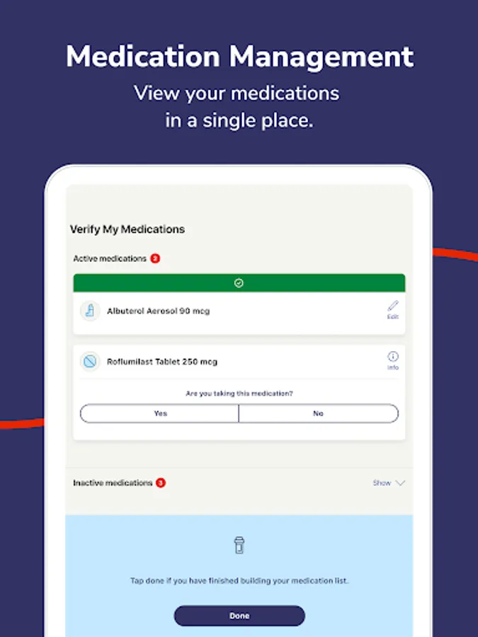 View your medications in a single place regardless of pharmacy. Indicate why you are taking the medication and confirm your dosage.