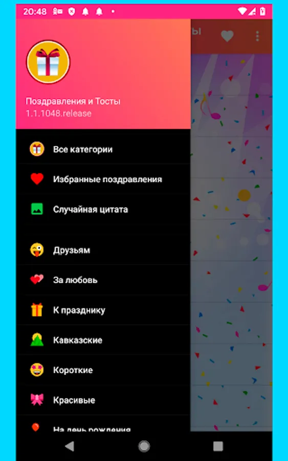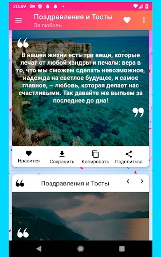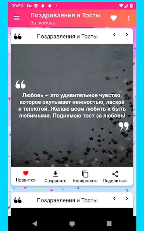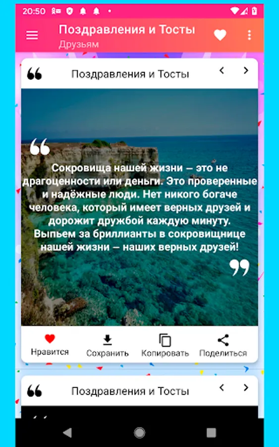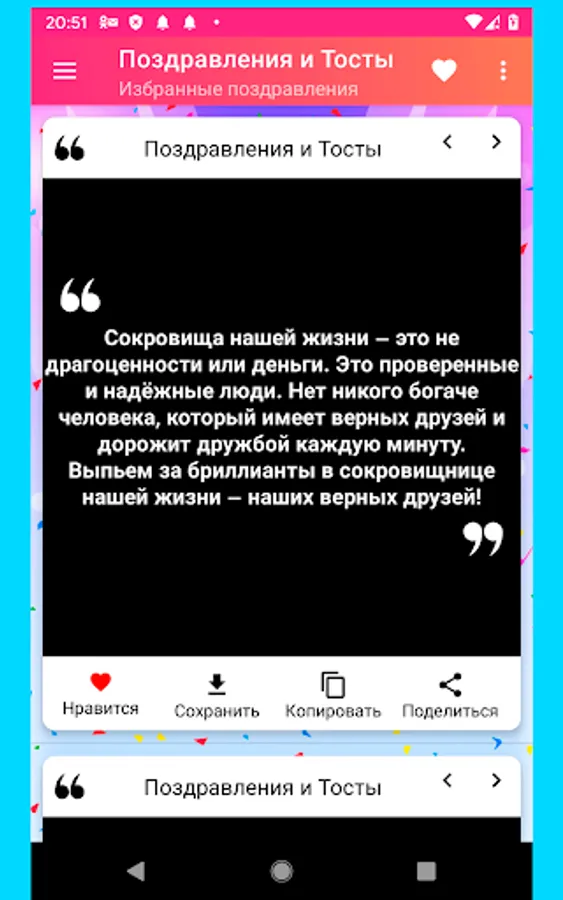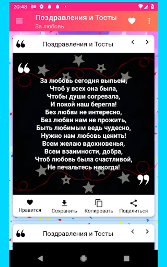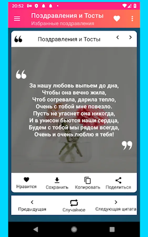 The postcard generator will allow you to save the selected template in the memory of your device, share the postcard on social networks, add your favorite greetings to your favorites!