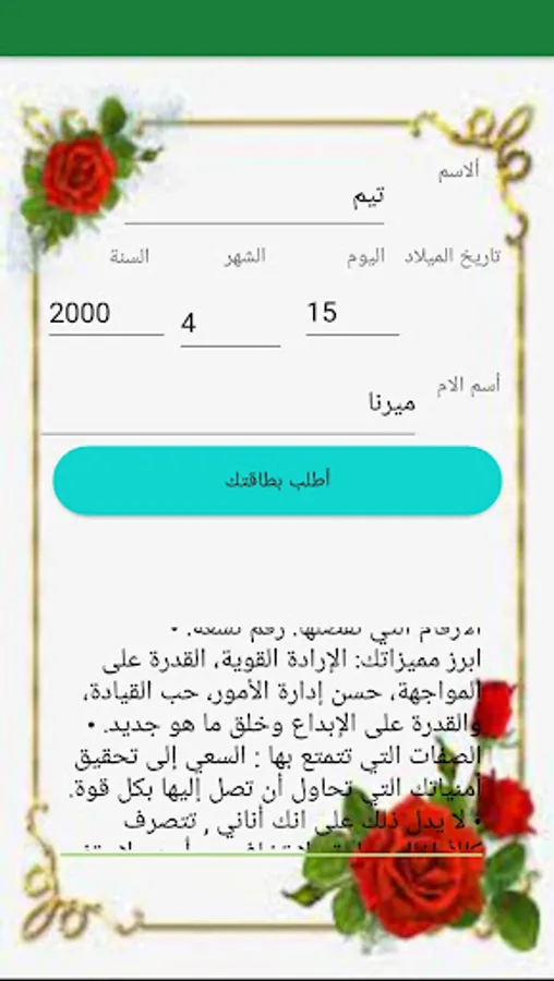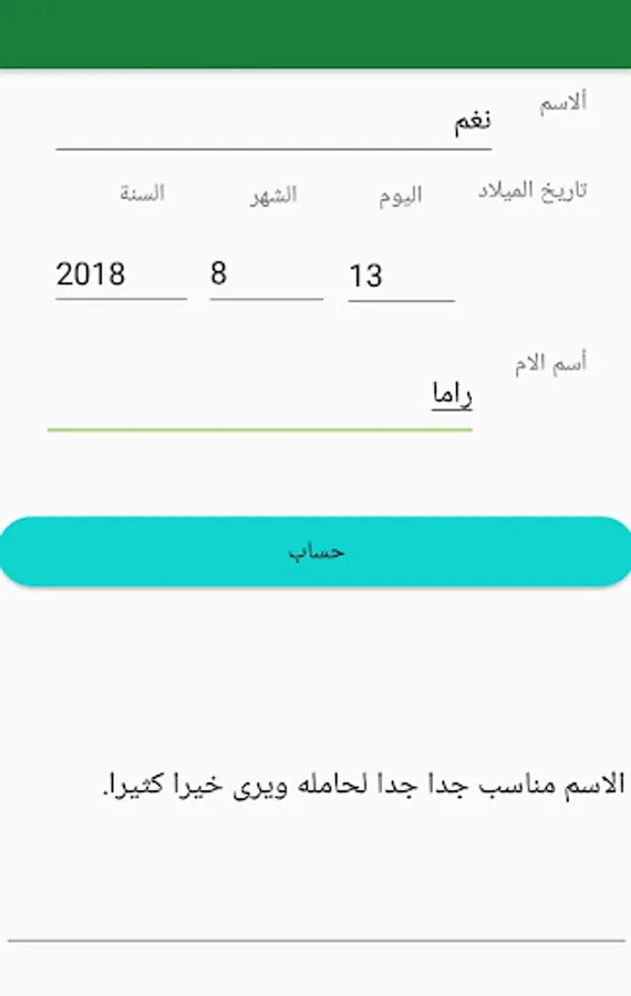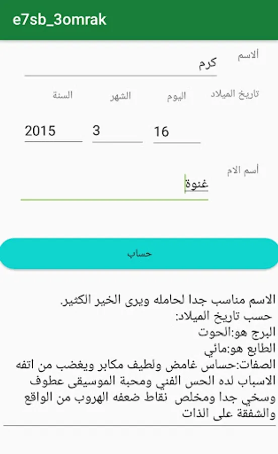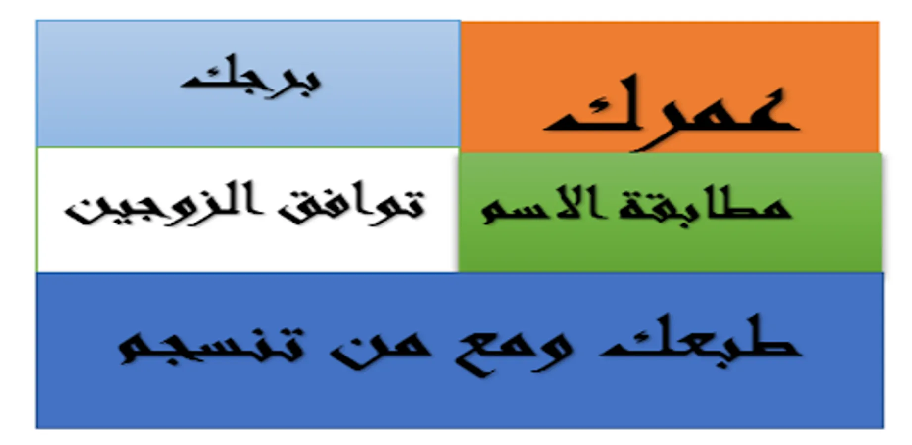 Calculation of age, horoscope, character, the consent of the spouses, the approval of the name of the bearer, or for those who want to explore if the name suits the newborn, according to the camel’s calculation, and the value of the name according to the camel’s calculation. Your personal card that bears your characteristics, your harmony with others, the things you like, your general character and other things, based on