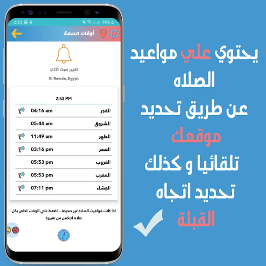 - Sets you the direction of the Qibla to ensure the correctness of the prayer, Qibla