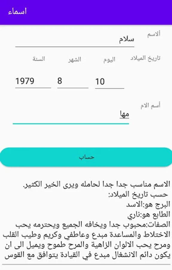 This application contains a large variety of beautiful names with their meanings - and calculating sentences to find out the compatibility or appropriateness of the name for the bearer, knowing the sign, its nature and attributes.