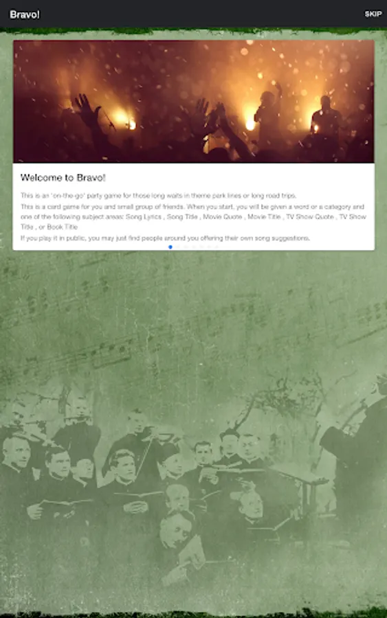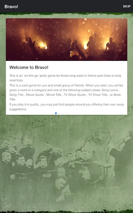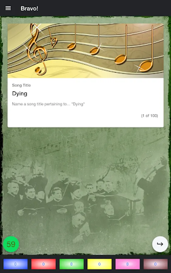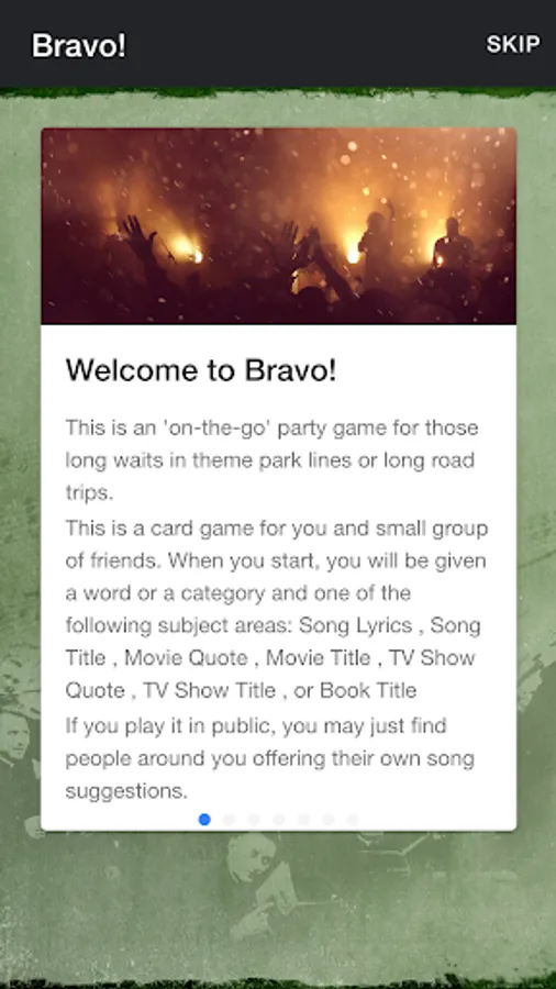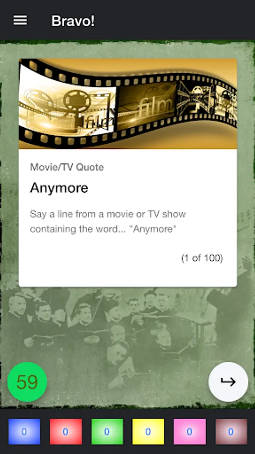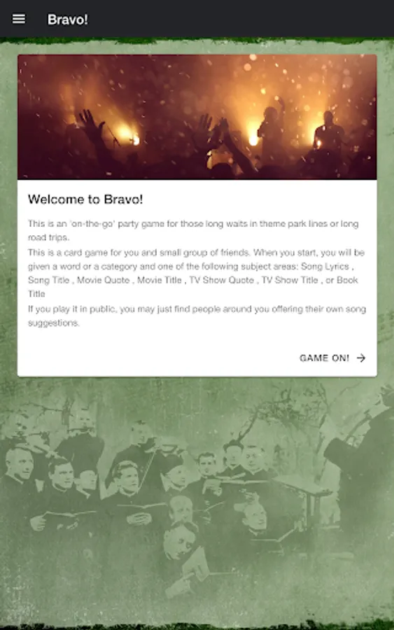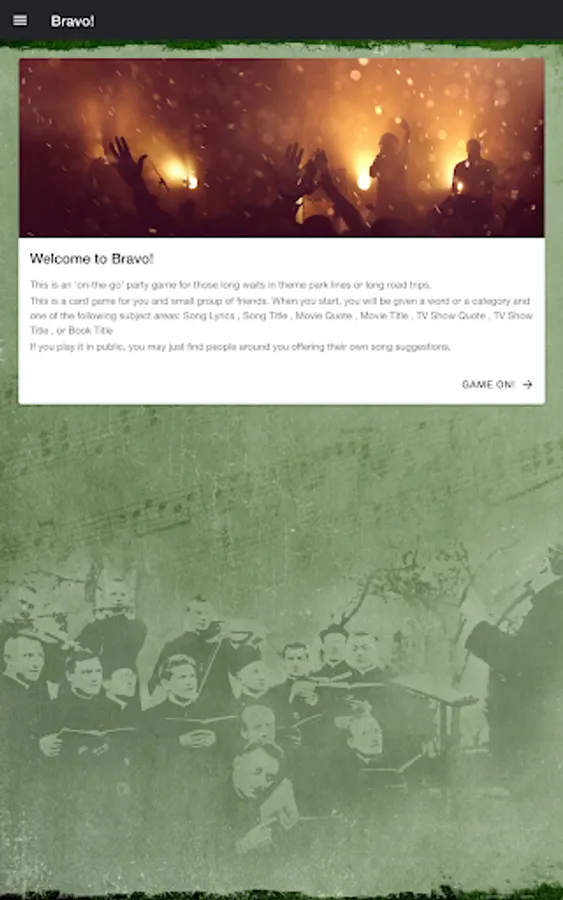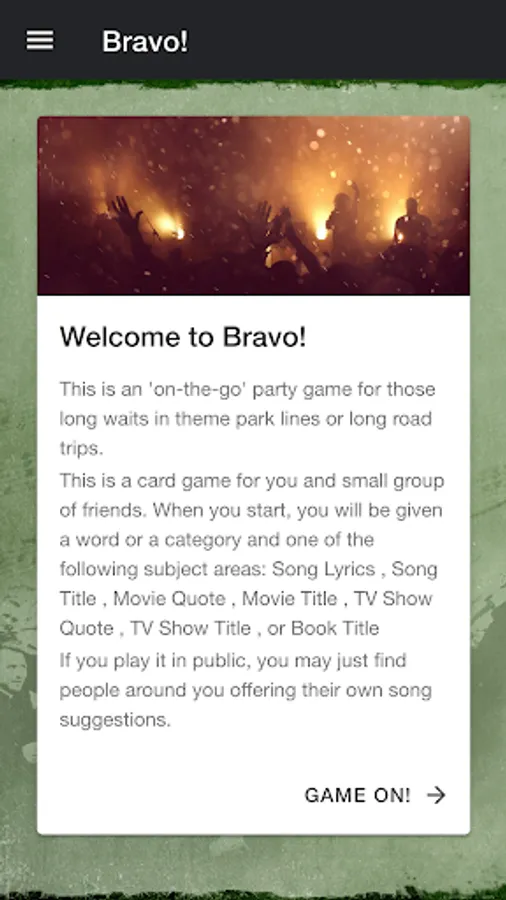 This is a card game for you and small group of friends. When you start, you will be given a word or a category and one of the following subject areas: Song Lyrics , Song Title , Movie Quote , Movie Title , TV Show Quote, TV Show Title , or Book Title