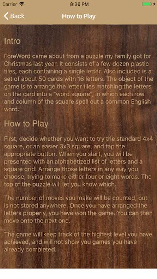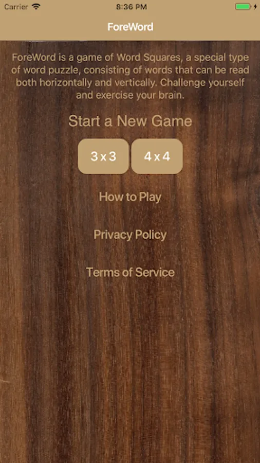 Foreword offers you 3x3 and 4x4 word puzzles in more than 9000 combinations. Play 2-3 times per day to challenge your wits and exercise your brain, for potentially years of gameplay.