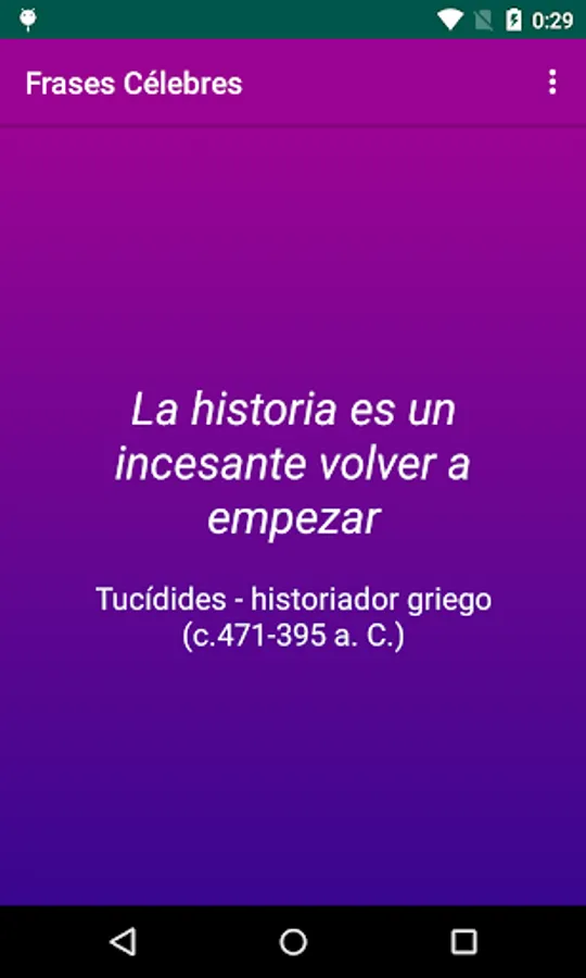 Do you want to spend a moment of reflection every day? If so, this app interests you. With it you will receive a famous phrase from a famous author every day. These phrases to think will make you reflect deeply and improve as a person. Listen to the teachings they have for you and learn something every day.