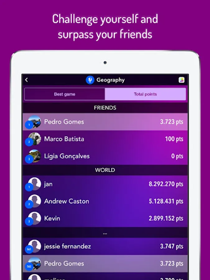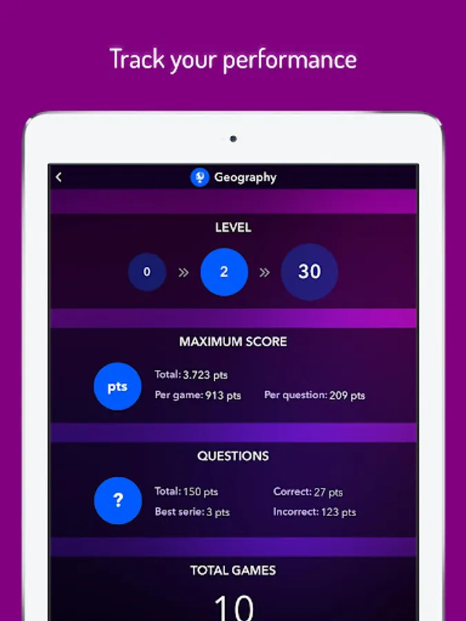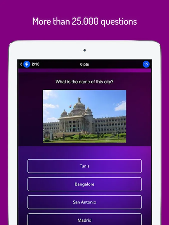 With thousand of questions from geography to entertainment, passing by sport and leisure, history, art and literature and much more, this is the perfect quiz game for you! We never stop improving it, adding new questions every day and new features regularly. :)