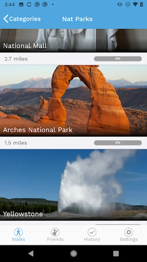 Free walks in each category (Appalachian Trail, Marathons, Cities, National Parks), then other walks are available for purchase for $0.99 (or equivalent local currency).