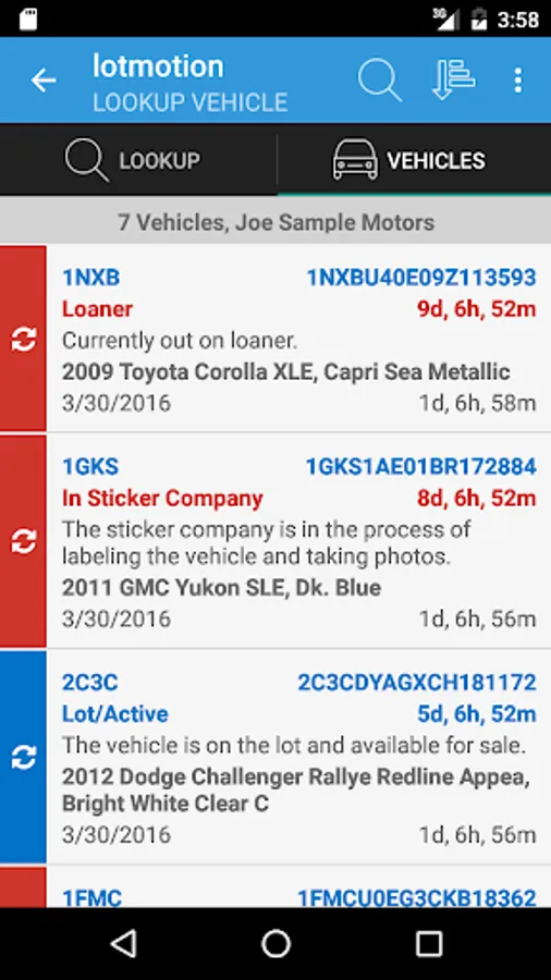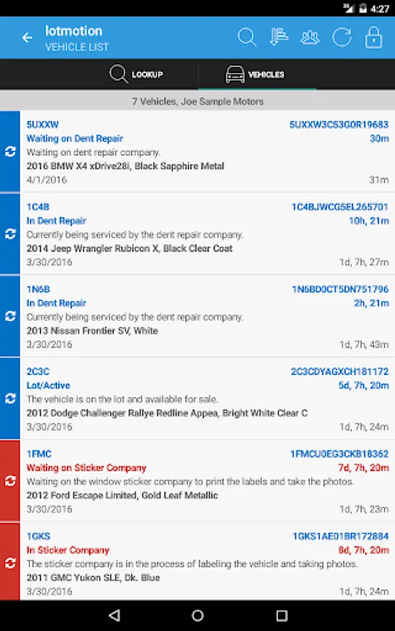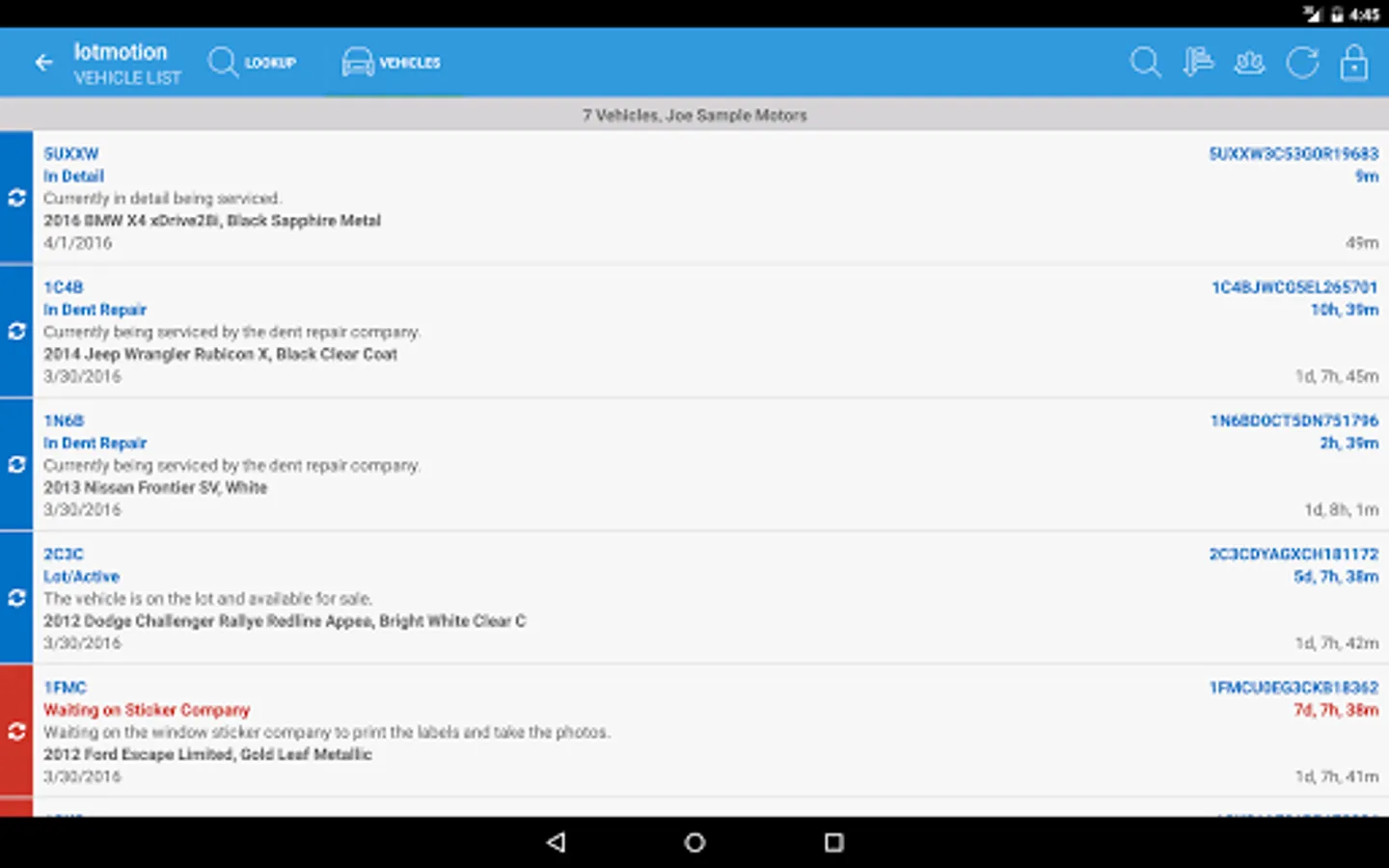 Seeing how long a vehicle is in any process is a breeze as each vehicle displays time in process in easy to read language such as 4d, 6h, 43m. Vehicles that are too long in process change colors and show easy to see icons to help easily see problematic vehicles in a list.