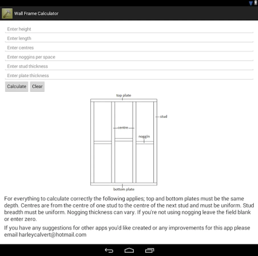 Wall Frame Calculator - Carpentry App. Calculates quantity and length of studs, quantity and length of noggins (if required) and quantity and length of plates.
