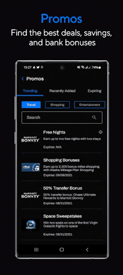 - Savings: Receive a curated feed of the best promos and deals, including Amex Offers, Chase Offers, travel deals, bank bonuses, and freebies.