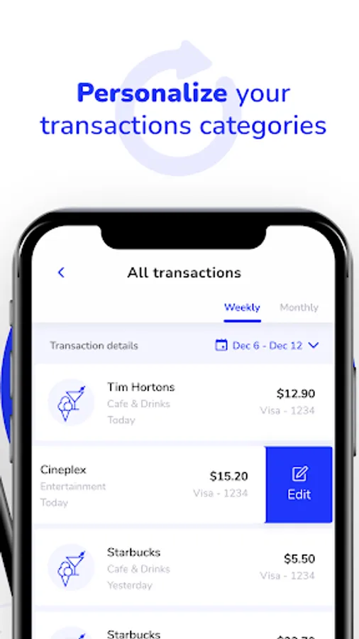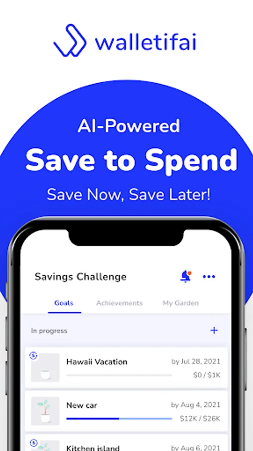 Set big or small goals like vacations, vehicle down payments, electronic devices, credit card debt payments, or anything you want! Walletifai will help you break them down into weekly or monthly steps and successfully achieve them.