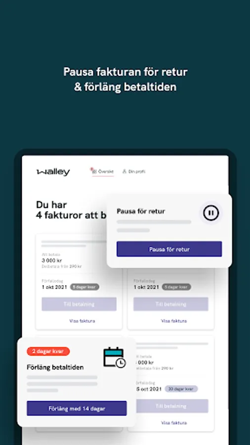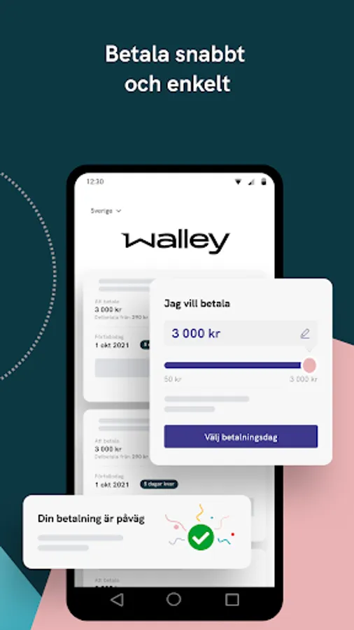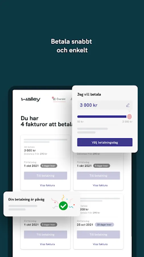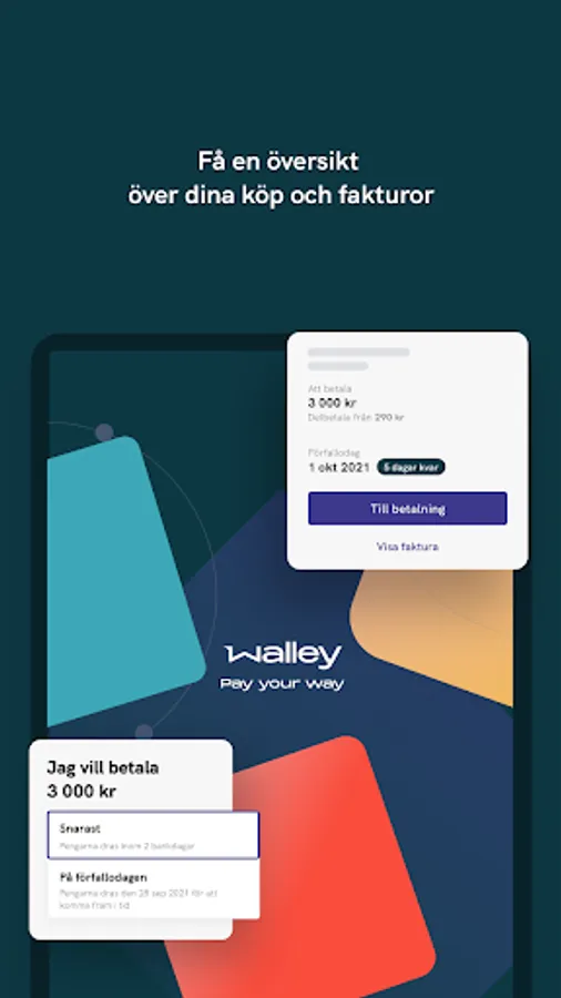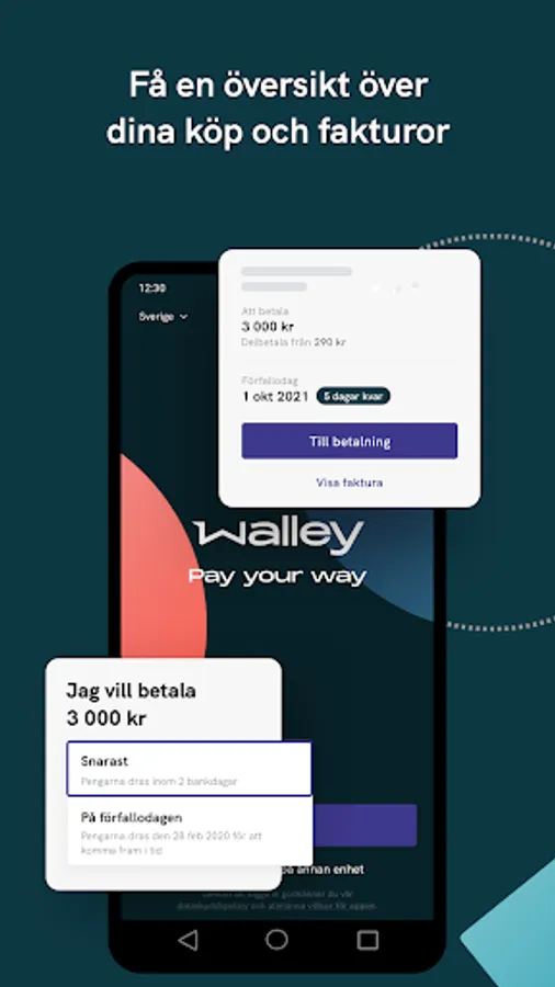 Med Walley kan du enkelt och tryggt ta kontrollen över dina betalningar. Oavsett om du handlar online eller i butik ska du alltid ha samma möjlighet att betala precis hur, och när, du vill. Med appen kan du: