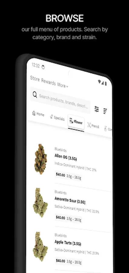 Browse our full menu of products. Search by category, brand and strain.