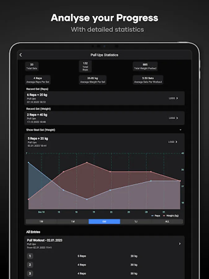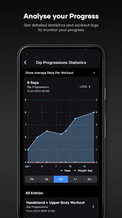 -> Track your improvements in Repetitions and Weights over time with charts that plot your progress