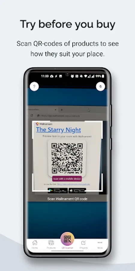 If you have a Wallnament QR-code of an item you found online, at a gallery or at a store, simply scan it with a built-in scanner. Then use our augmented reality (AR) technology to virtually hang and compare your chosen paintings, posters, stickers, photographs or other printouts and wall décor items. Get the most out of your purchase!