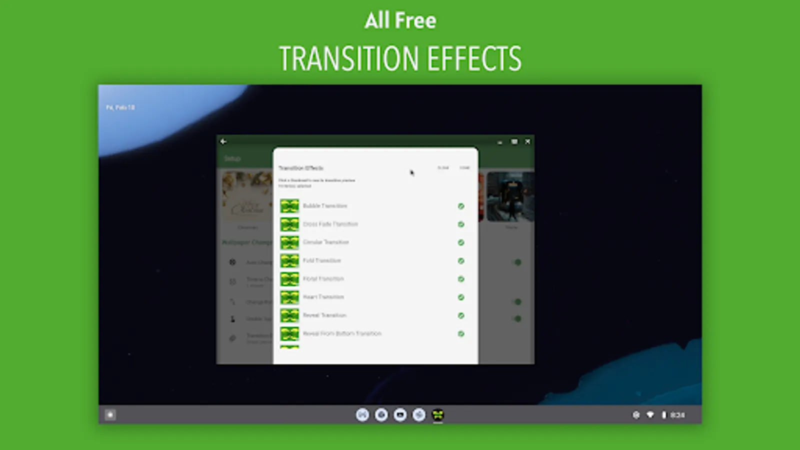 HD Wallpaper changer with various beautiful Transition Effects. Easy to use, just set your image folders and forget it.