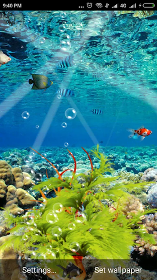 Enjoy the beautiful sea world on your home screen that can make your day beautiful and calm you down if you feel tensed. This free live wallpapers gallery consists of amazing ocean fish wallpapers and tropical fish backgrounds so you can change them whenever you want. Choose the exotic wallpaper HD you like the most and watch how the bubbles of different size start to float on your screen turning it into a real Live Aquarium Magic Fishes Wallpaper.