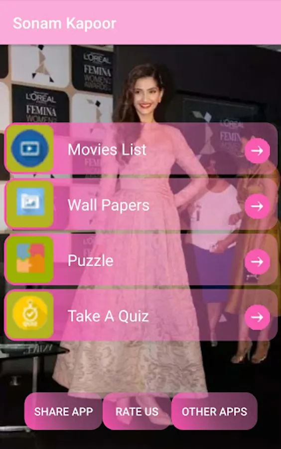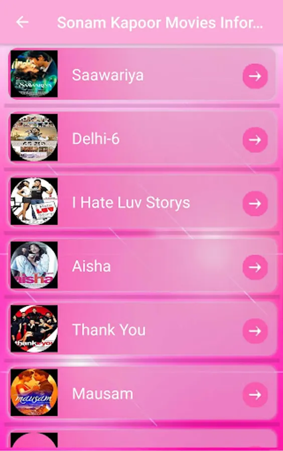 This Application display the information of Sonam Kapoor movies, it will not play any video or audio of her movies, It is a multi purpose application to Sonam Kapoor followers, App contains four options.