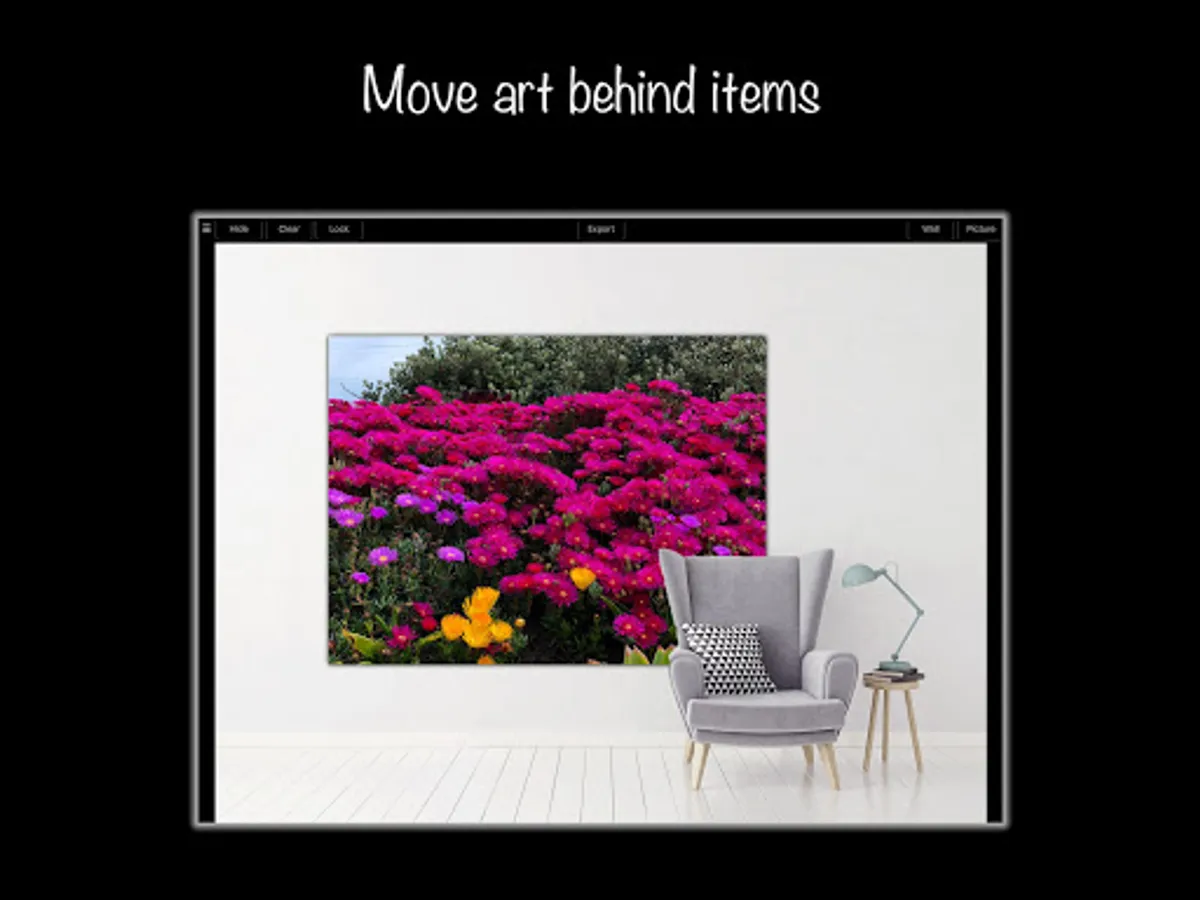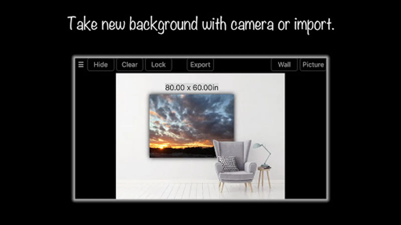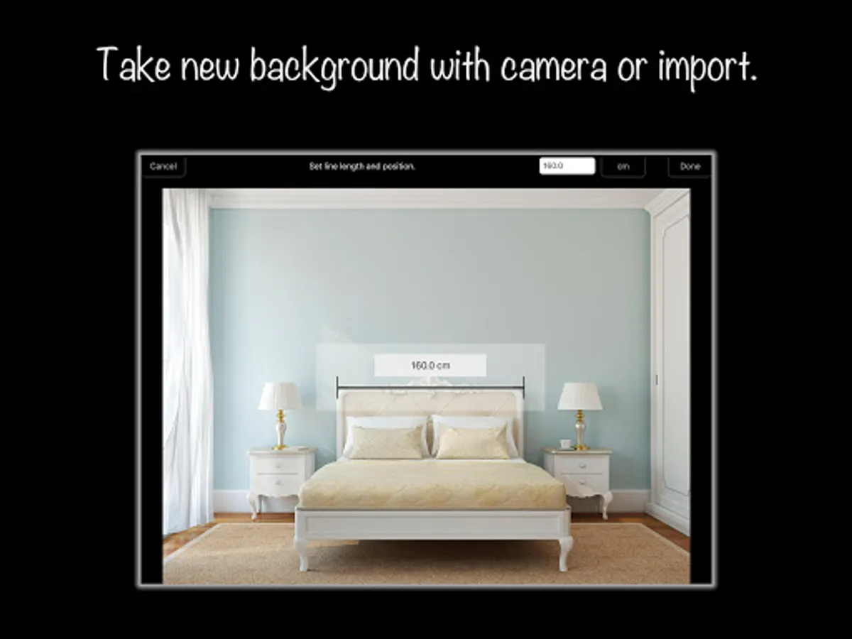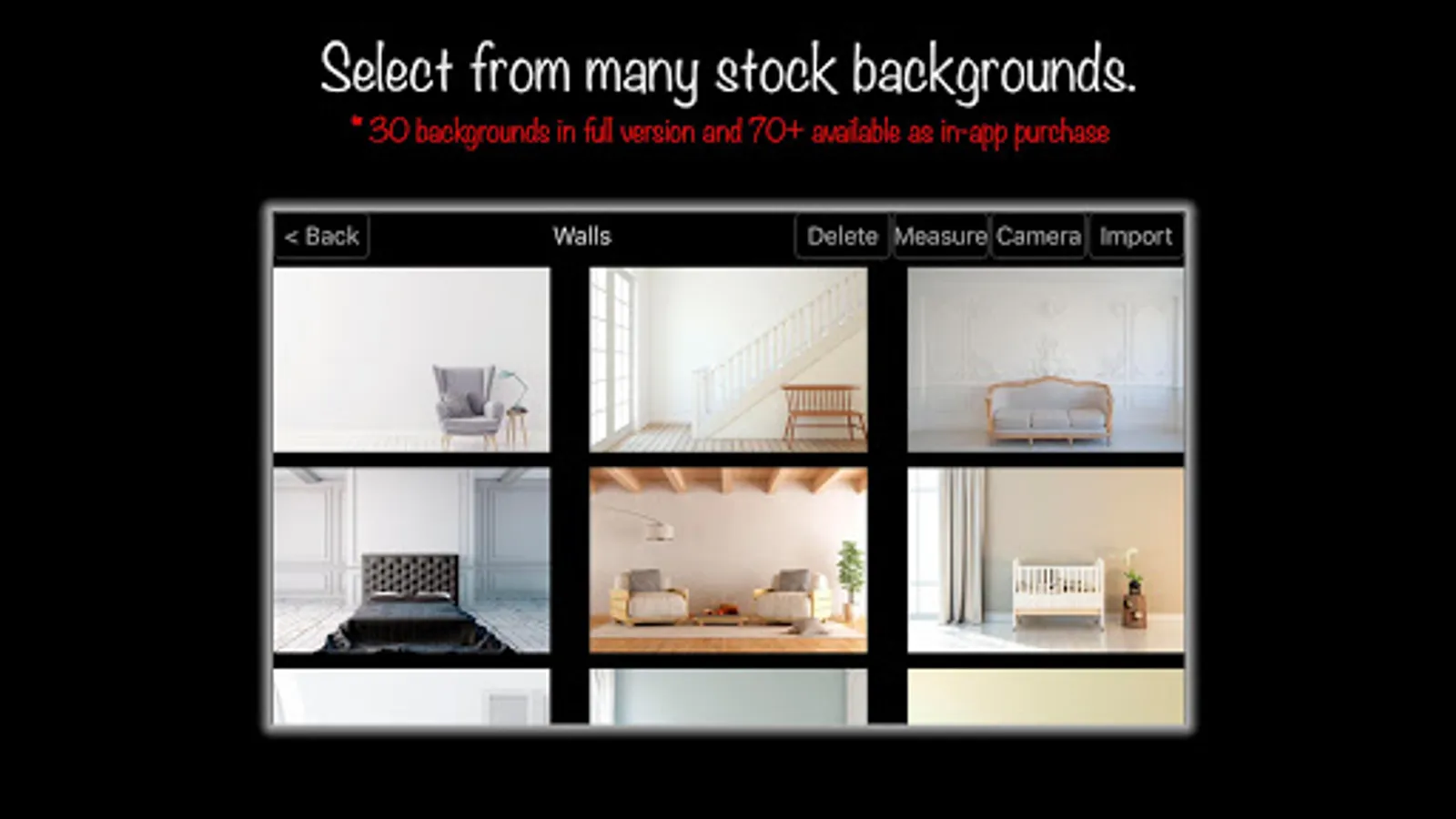 • Use gallery of 40 default stylish interiors or capture/import a photography of your own room and use it as a background.