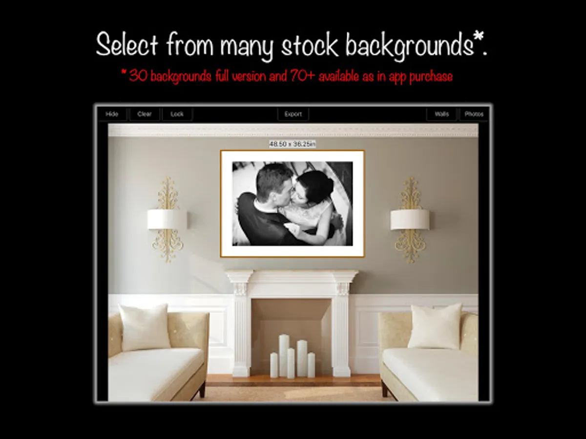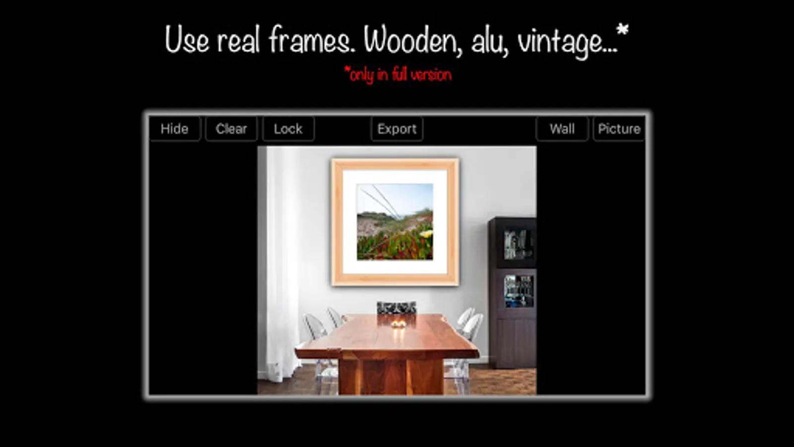WallPicture app helps many photographers, designers and artists around the world to show their work to customers. Design your art, canvas, photography or picture on your own wall or just use one of 40 default backgrounds of interior rooms included in an app. You can frame and snap picture in real interior like kitchen, living room, hall, bedroom or wherever you want. Show professionally your work to clients you have by using this app called - WallPicture.