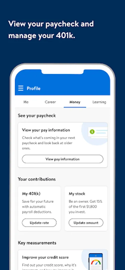 • Money: Access your pay information, view personalized 401(k) and stock purchase insights, build your credit score, setup direct deposit, and more.