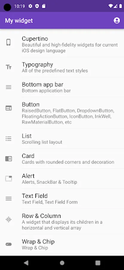 This is an application that shows you the UI created by some commonly used Widgets in Flutter to develop applications.