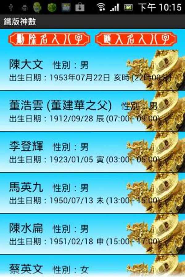 This software contains 16 kinds of iron version of God to fetch various fortune-angle. Also contains more than one hundred Hong Kong and Taiwan celebrities, stars, artists horoscopes for study and reference.