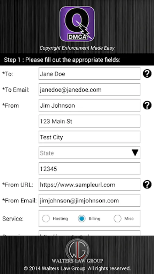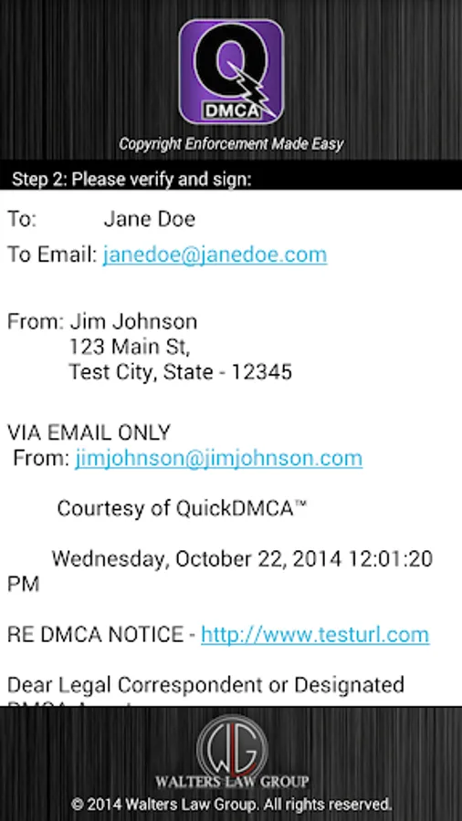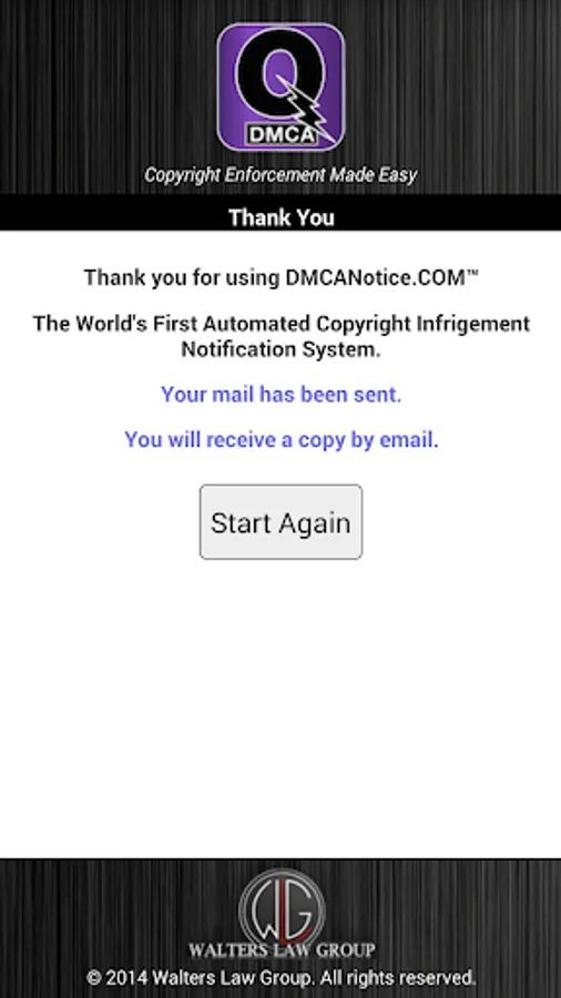 Developed by Lawrence G. Walters, Esq., Internet attorney and inventor of the patented BirthDateVerifer™, the Quick2257® mobile app, and other technology designed for the online entertainment industry, this app streamlines the process of generating and transmitting DMCA Notices for the purpose of enforcing copyrights and taking down infringing material. Anyone involved in the creation or publication of digital media can now quickly generate and send the necessary Notification of Infringement under federal law, using this simple mobile app.