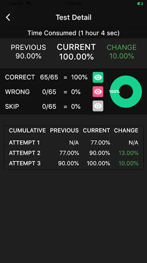 *Shows detail breakdown on each test attempt with percent improvement