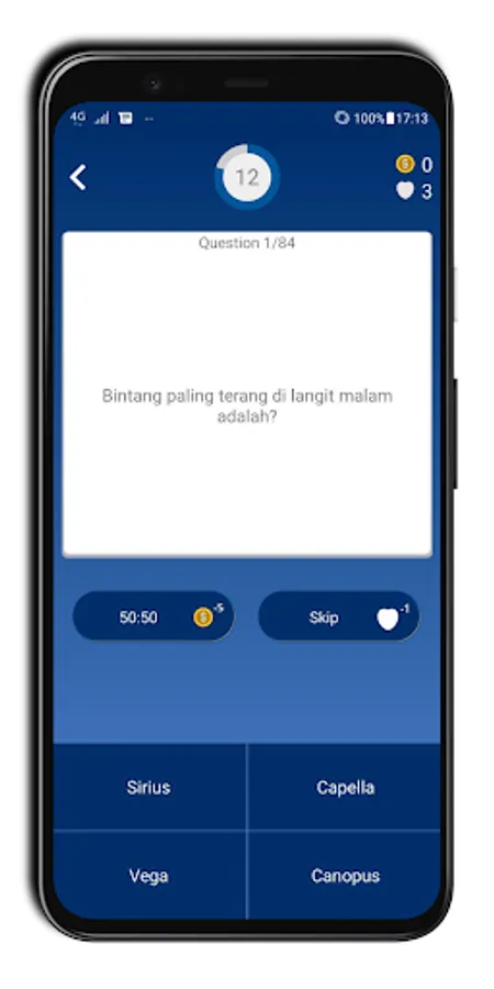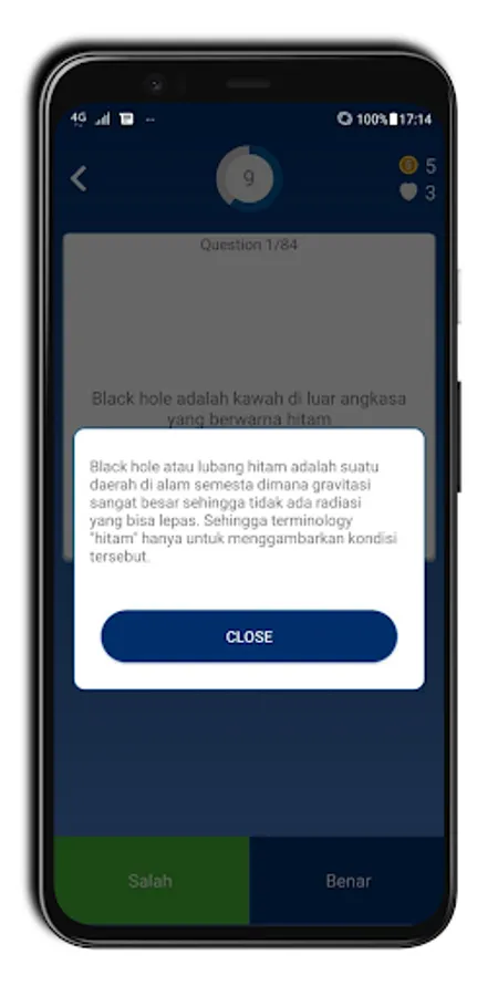 Astronomy-themed quiz game application in Indonesian language. Currently there are dozens of quiz questions and will continue to grow automatically from the server. Internet connection required for synchronization problems or new quiz.