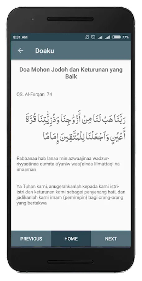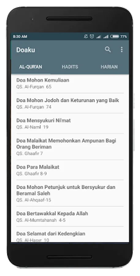 Views are divided into tabs into three categories based on sources, namely Al-Qur'an, Hadith, and Daily. Especially for daily prayers can be from the Qur'an or Hadith.