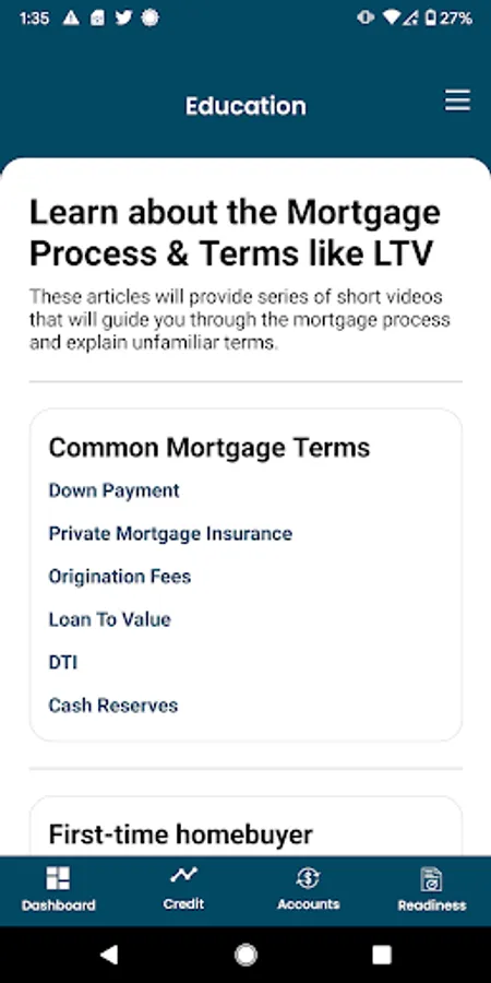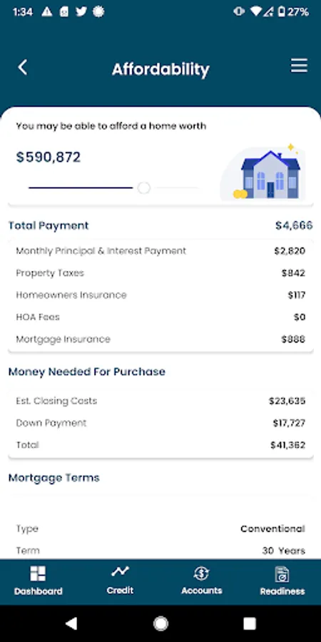 Work with What’s A Mortgage to best prepare you for home ownership by planning for a down payment, establishing reserves, managing your debt to income ratio, improving or maintaining your credit, loan scenarios through our calculators, establish your projected loan to value, and more. Visit the readiness assessment in your app to see a snapshot of your credit overview, debt to income ratio, cash reserves, employment, down payment and sales price.