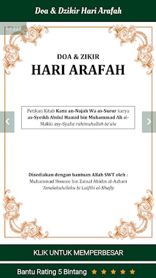 This application contains the Prayer Book and Dhikr Hari Arafah - Author of Sheikh Muhammad Husni bin Zainal 'Abidin Al-azhari.