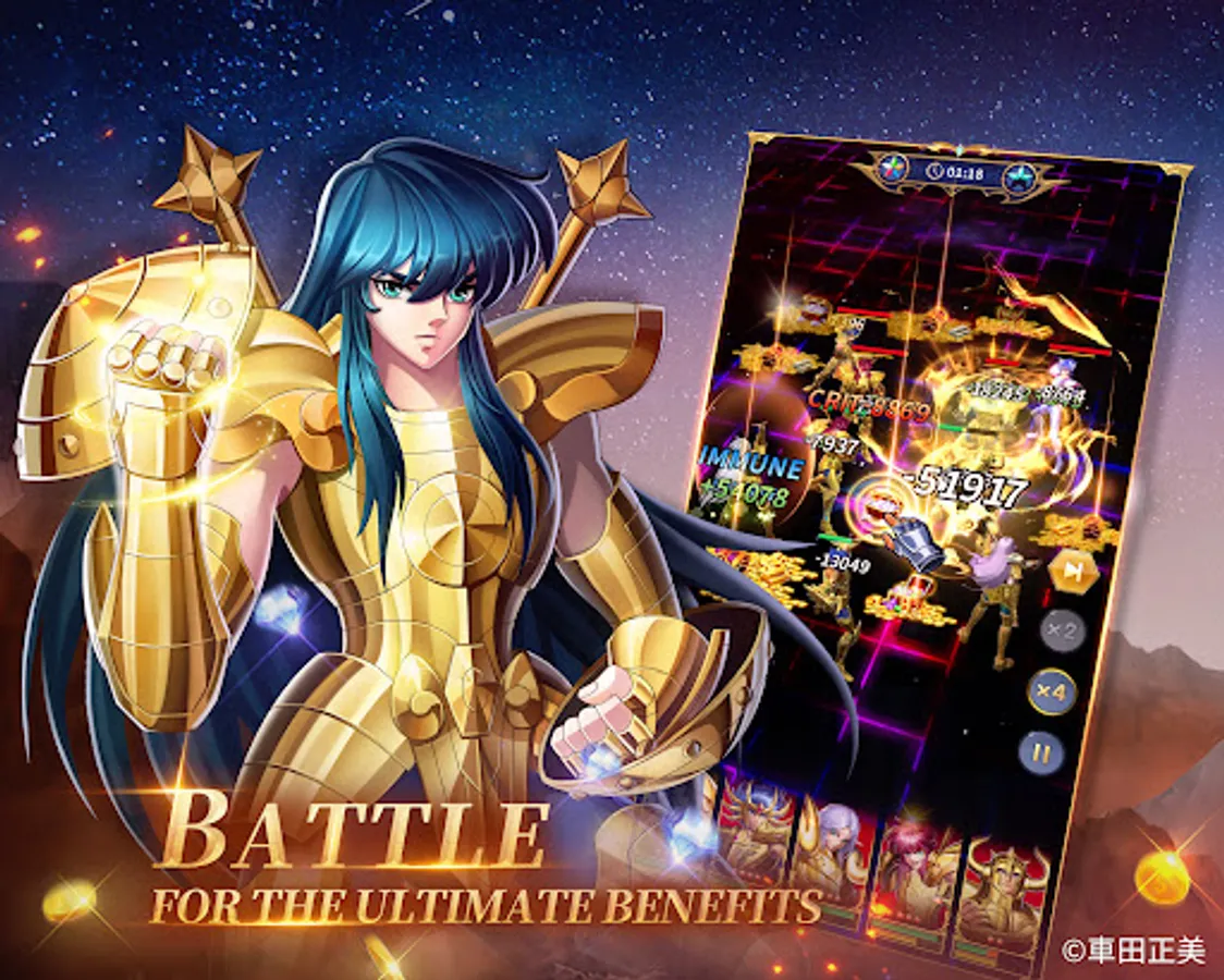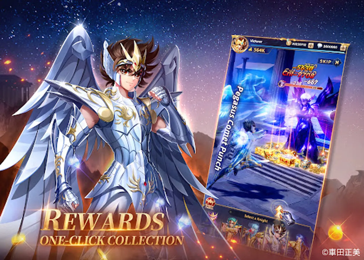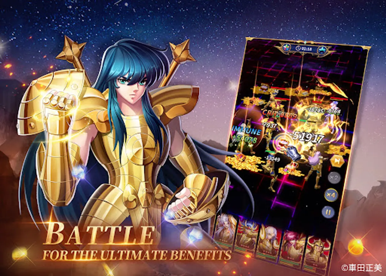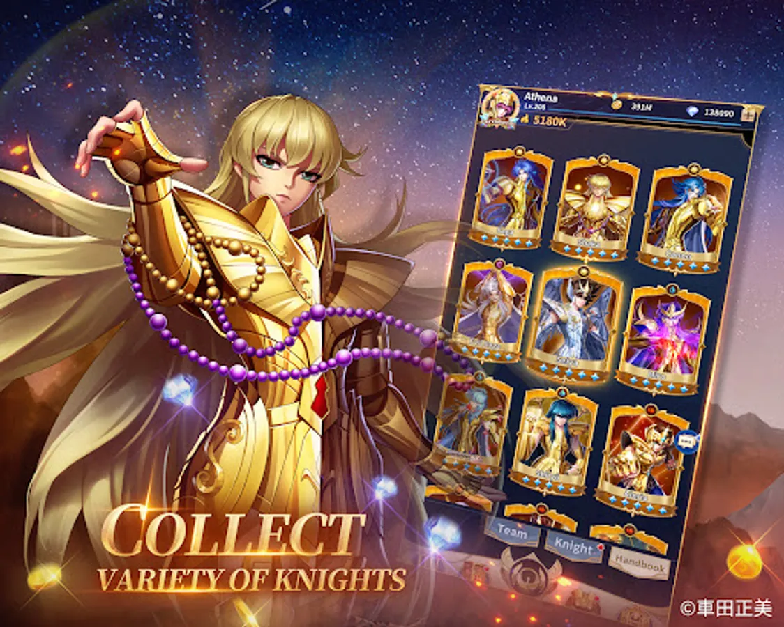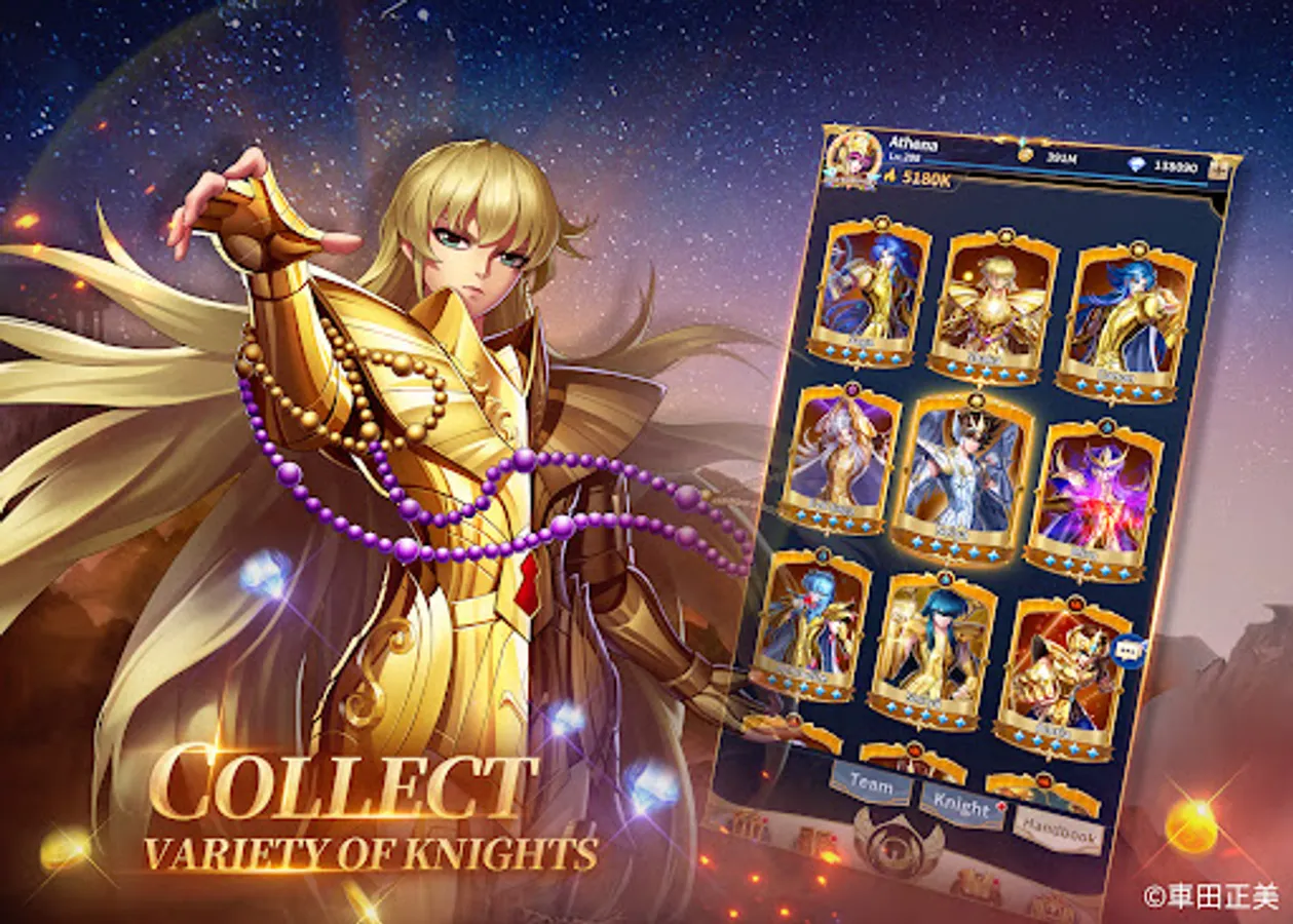 The 88 Knights under the Goddess Athena assemble! Pegasus Seiya, Phoenix Ikki, Virgo Shaka and Gemini Saga are all here at your command. Gather your favorite knights to form the strongest team for guarding the Goddess!