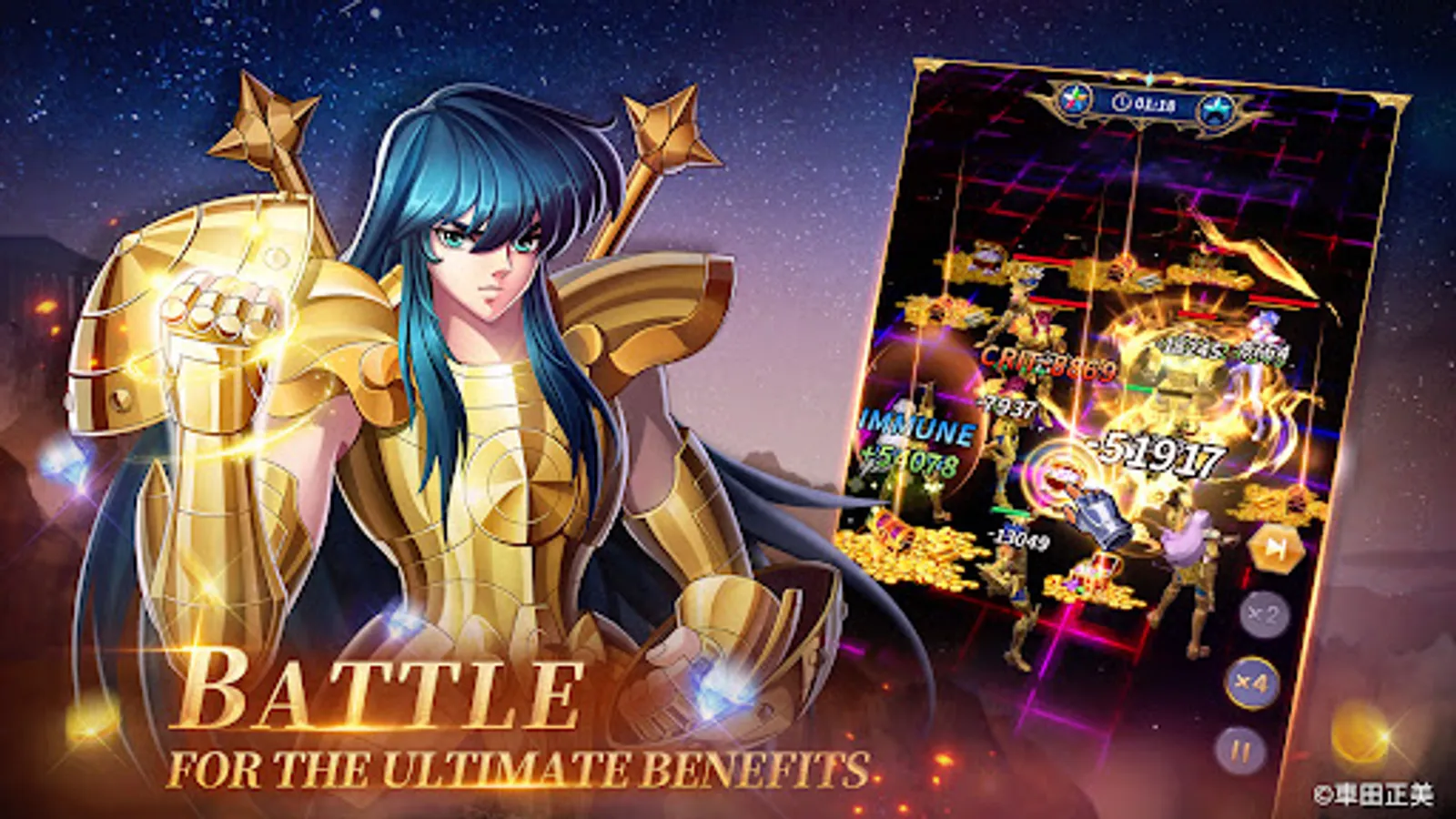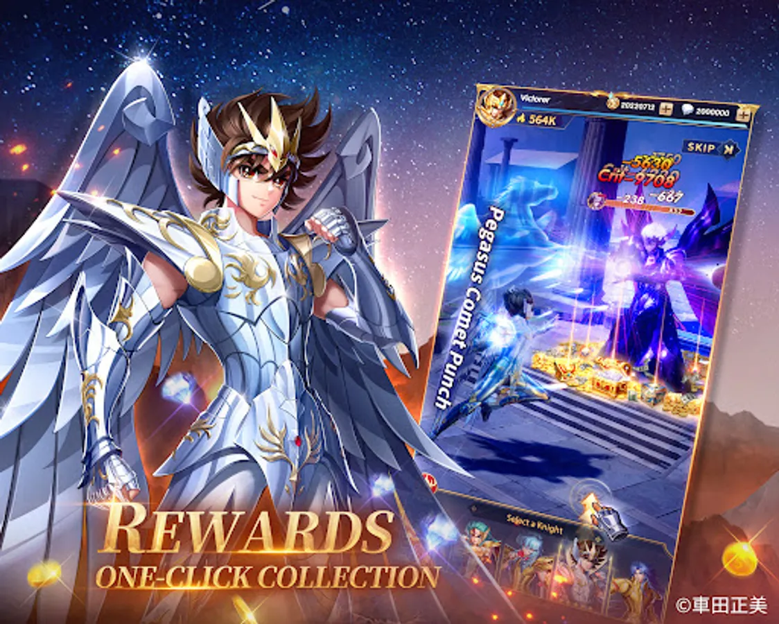 The 88 Knights under the Goddess Athena assemble! Pegasus Seiya, Phoenix Ikki, Virgo Shaka and Gemini Saga are all here at your command. Gather your favorite knights to form the strongest team for guarding the Goddess!